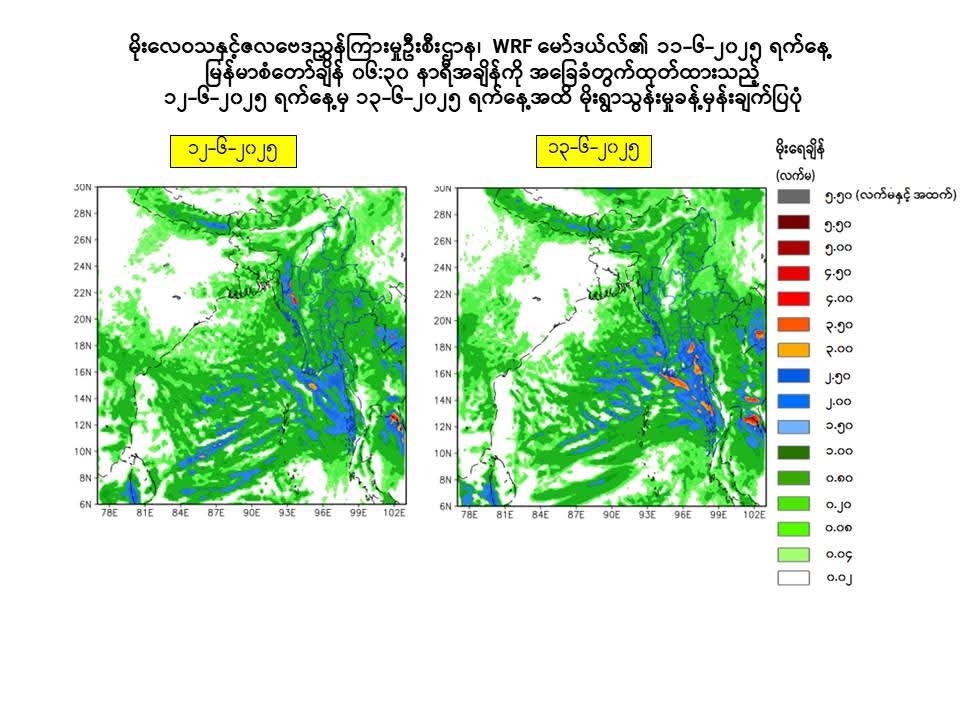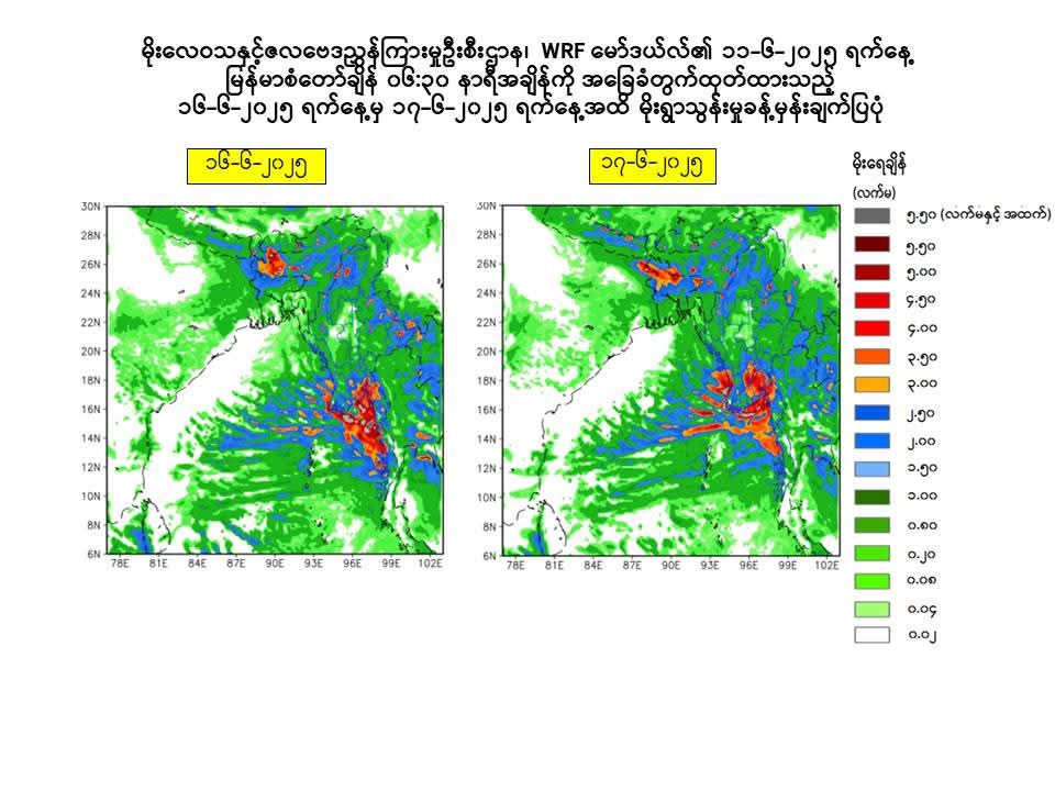 ၁။ ယနေ့မြန်မာစံတော်ချိန် ၁၆:၃၀ နာရီအချိန် တိုင်းထွာချက်များအရ ကပ္ပလီပင်လယ်ပြင်နှင့် ဘင်္ဂလားပင်လယ်အော်တို့တွင် မုတ်သုံလေ အားကောင်းရာမှ အားအလွန်ကောင်းနေခြင်းကြောင့် လည်းကောင်း၊ အရှေ့ဘက်မှ ရွေ့လျားလာသော လေပွေလှိုင်းများ၏ အရှိန်ကြောင့်လည်းကောင်း ယနေ့ညနေမှ ၁၇-၆-၂၀၂၅ ရက်နေ့အတွင်း နေပြည်တော်၊ ရန်ကုန်တိုင်းဒေသကြီး၊ မန္တလေးတိုင်း ဒေသကြီး၊ ပဲခူးတိုင်းဒေသကြီး၊ မကွေးတိုင်းဒေသကြီး၊ စစ်ကိုင်းတိုင်းဒေသကြီး၊ ဧရာဝတီတိုင်းဒေသကြီး၊ တနင်္သာရီတိုင်းဒေသကြီး၊ ကချင်ပြည်နယ်၊ ကယားပြည်နယ်၊ ကရင်ပြည်နယ်၊ ချင်းပြည်နယ်၊ မွန် ပြည်နယ်၊ ရခိုင်ပြည်နယ်နှင့် ရှမ်းပြည်နယ်တို့တွင် နေရာစိပ်စိပ်မှ နေရာအနှံ့အပြား မိုးထစ်ချုန်းရွာပြီး၊ အချို့ ဒေသများတွင် ဒေသအလိုက်နှင့် နေရာကွက်၍ မိုးကြီးမည်။ မြစ်ဝကျွန်းပေါ်၊ မုတ္တမကွေ့၊ မွန်-တနင်္သာရီကမ်းရိုးတန်းတစ်လျှောက်နှင့် ကမ်းလွန်ပင်လယ်ပြင် တို့တွင် ရံဖန်ရံခါ မိုးသက်လေပြင်းများ ကျရောက်ပြီး လှိုင်းကြီးမည်။ မိုးသက်လေပြင်းကျစဉ် ရေပြင်/မြေပြင်လေသည် တစ်နာရီလျှင် မိုင် ၃၀ မှ ၃၅ မိုင်အထိ တိုက်ခတ်နိုင်ပါသည်။ လှိုင်းအမြင့်မှာ မြစ်ဝကျွန်းပေါ်၊ မုတ္တမကွေ့၊ မွန်-တနင်္သာရီ ကမ်းရိုးတန်းတစ်လျှောက်နှင့် ကမ်းလွန်ပင်လယ်ပြင်တို့တွင် ၉ ပေမှ ၁၁ ပေခန့် ရှိနိုင်ပါသည်။”