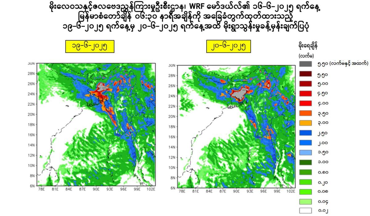 သို့ဖြစ်ပါ၍ မိုးသည်းထန်စွာရွာသွန်းခြင်းနှင့်အတူ လေပြင်းတိုက်ခတ်ခြင်း၊ မိုးထစ်ချုန်းခြင်း၊ မိုးကြိုးပစ်ခြင်း၊ လျှပ်စီးလက်ခြင်း၊ မိုးသီးကြွေခြင်း၊ လျှပ်တစ်ပြက်ရေကြီးခြင်းနှင့် မြေပြိုခြင်းစသည့် သဘာဝဘေးအန္တရာယ်များ ဖြစ်ပေါ်နိုင်ပါသဖြင့် အဆိုပါဒေသများရှိ ကုန်းမြင့်ဒေသအနီးတွင် နေထိုင် ကြသူများအနေဖြင့် မြေပြိုမှုအန္တရာယ်၊ မြစ်ငယ်၊ ချောင်းငယ်များအနီးတွင် နေထိုင်ကြသူများအနေဖြင့် ရေကြီး၊ ရေလျှံမှုများကို ကြိုတင်သတိပြုရှောင်ရှားနိုင်ပါရန်နှင့် ပြည်တွင်းရေကြောင်းသွားလာရေး၊ လေကြောင်းပျံသန်းရေးနှင့် ဆည်မြောင်းတာတမံများအနေဖြင့် လိုအပ်သည်များ ကြိုတင်ပြင်ဆင် ဆောင်ရွက်ထားနိုင်ပါရန် သတိပေးနှိုးဆော်အပ်ပါသည်။