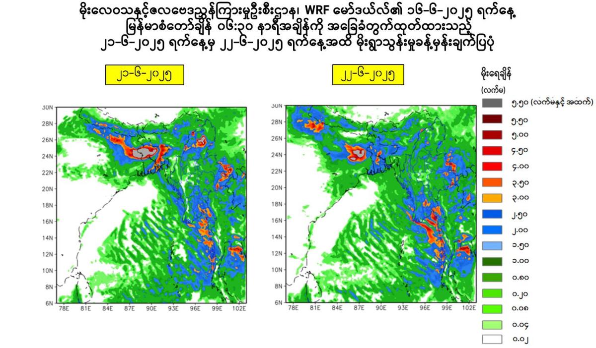ယနေ့မြန်မာစံတော်ချိန် ၁၆:၃၀ နာရီအချိန် တိုင်းထွာချက်များအရ ကပ္ပလီပင်လယ်ပြင်နှင့် ဘင်္ဂလားပင်လယ်အော်တို့တွင် မုတ်သုံလေအားကောင်းရာမှ အားအလွန်ကောင်းနေခြင်းကြောင့် လည်းကောင်း၊ အရှေ့ဘက်မှရွေ့လျားလာသော လေပွေလှိုင်းများ၏ အရှိန်ကြောင့်လည်းကောင်း၊ အနောက်ဘက်မှရွေ့လျားလာသော လေပွေလှိုင်းများ၏ အရှိန်ကြောင့်လည်းကောင်း ယနေ့ညနေမှ ၂၂-၆-၂၀၂၅ ရက်နေ့အတွင်း နေပြည်တော်၊ ရန်ကုန်တိုင်းဒေသကြီး၊ မန္တလေးတိုင်းဒေသကြီး၊ ပဲခူး တိုင်းဒေသကြီး၊ မကွေးတိုင်းဒေသကြီး၊ စစ်ကိုင်းတိုင်းဒေသကြီး၊ ဧရာဝတီတိုင်းဒေသကြီး၊ တနင်္သာရီ တိုင်းဒေသကြီး၊ ကချင်ပြည်နယ်၊ ကယားပြည်နယ်၊ ကရင်ပြည်နယ်၊ ချင်းပြည်နယ်၊ မွန်ပြည်နယ်၊ ရခိုင်ပြည်နယ်နှင့် ရှမ်းပြည်နယ်တို့တွင် နေရာစိပ်စိပ်မှ နေရာအနှံ့အပြား မိုးထစ်ချုန်းရွာပြီး၊ အချို့ဒေသ များတွင် ဒေသအလိုက်နှင့် နေရာကွက်၍ မိုးကြီးမည်။ မြန်မာ့ကမ်းရိုးတန်းတစ်လျှောက်နှင့် ကမ်းလွန်ပင်လယ်ပြင်တို့တွင် ရံဖန်ရံခါ မိုးသက်လေပြင်းများကျရောက်ပြီး လှိုင်းကြီးမည်။ မိုးသက်လေပြင်း ကျစဉ် ရေပြင်/မြေပြင်လေသည် တစ်နာရီလျှင် ၃၅ မိုင်အထိ တိုက်ခတ်နိုင်ပါသည်။ လှိုင်းအမြင့်မှာ မြန်မာ့ကမ်းရိုးတန်းတစ်လျှောက်နှင့် ကမ်းလွန် ပင်လယ်ပြင်တို့တွင် ၁၀ ပေမှ ၁၂ ပေခန့် ရှိနိုင်ပါသည်။