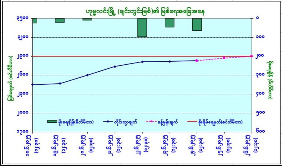ယနေ့မြန်မာစံတော်ချိန် ၁၂:၃၀ နာရီအချိန် တိုင်းထွာချက်အရ ချင်းတွင်းမြစ်ရေသည် ဟုမ္မလင်းမြို့တွင် ယင်းမြို့၏ စိုးရိမ်ရေမှတ်အောက် ၂ ပေခွဲခန့်တွင် ရောက်ရှိနေပါသည်။ အဆိုပါမြစ်ရေသည် နောက် ၂ ရက်အတွင်း ယင်းမြို့၏ စိုးရိမ်ရေမှတ်သို့ ရောက်ရှိနိုင်ပါသည်။