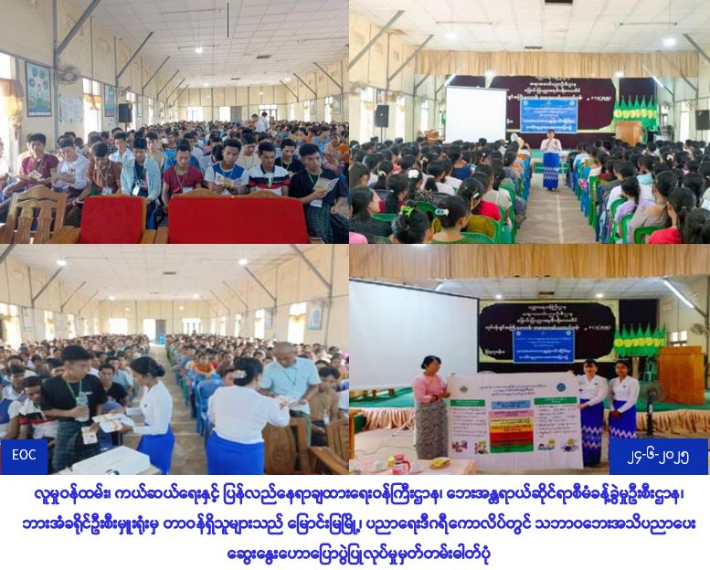 လူမှုဝန်ထမ်း၊ ကယ်ဆယ်ရေးနှင့်ပြန်လည်နေရာချထားရေးဝန်ကြီးဌာန၊ ဘေးအန္တရာယ်ဆိုင်ရာစီမံ ခန့်ခွဲမှုဦးစီးဌာန၊ မြောင်းမြခရိုင်ဦးစီးမှူးရုံးမှ တာဝန်ရှိသူများသည် (၂၄-၆-၂၀၂၅ )ရက်နေ့၊ နံနက် (၀၉:၃၀) နာရီအချိန်မှ (၁၂:၀၀) နာရီအချိန်အထိ မြောင်းမြမြို့၊ ပညာရေးဒီဂရီကောလိပ်တွင် ဆရာ၊ ဆရာမများနှင့် ကျောင်းသား/သူများ စုစုပေါင်း (၅၀၀)ဦးအား ဘေးအန္တရာယ်ဆိုင်ရာစီမံခန့်ခွဲမှုဦးစီးဌာန၏ လုပ်ငန်းဆောင်ရွက်နေမှုများ၊ ထောက်ပံ့ပေးမှုများ၊ သဘာဝဘေးနှင့်ပတ်သက်သည့် ဆောင် ရန်/ ရှောင်ရန်များ၊ မီးခိုးညစ်ညမ်းမှုအကြောင်း၊ တောမီးအန္တရာယ်အကြောင်းနှင့် ပလတ်စတစ်ညစ်ညမ်းမှုအကြောင်း၊ သဘာဝဘေးများနှင့်ပတ်သက်၍ ဆောင်ရန်/ ရှောင်ရန် အချက်များ ဆွေးနွေးဟောပြောခဲ့ပြီး နံရံကပ်ပိုစတာနှင့် လက်ကမ်းစာစောင်များ ပေးအပ်ခြင်းများ ဆောင်ရွက်ခဲ့ကြောင်း သတင်းရရှိပါသည်။