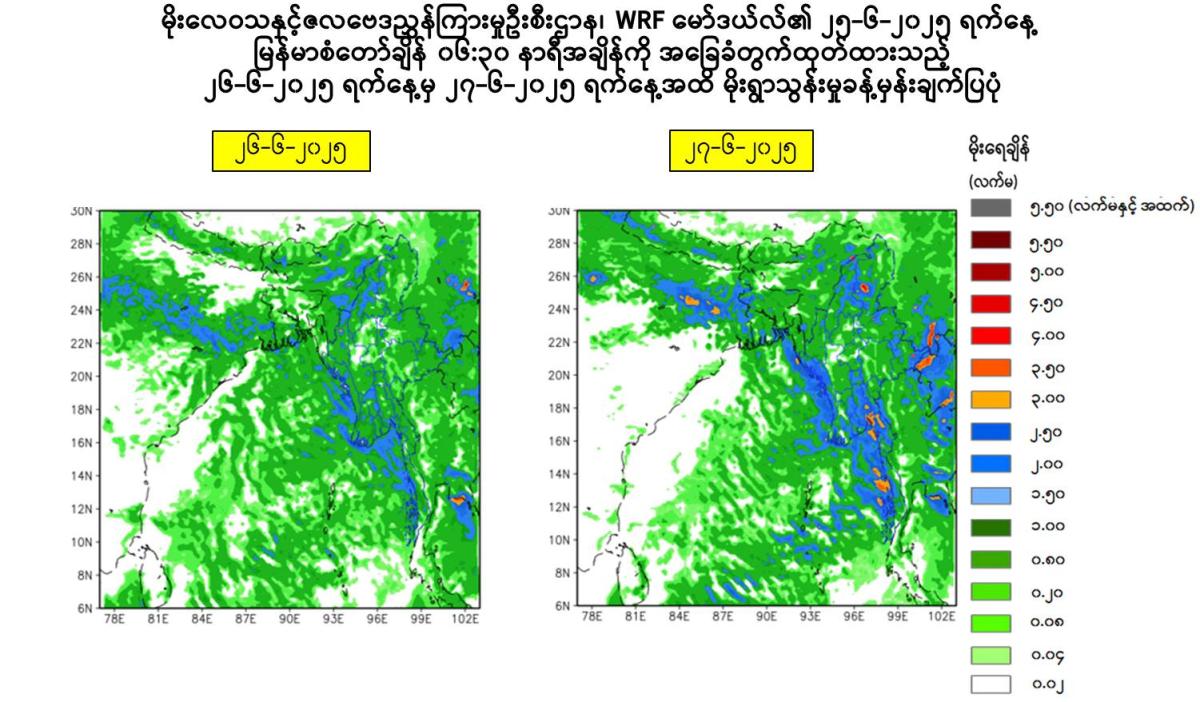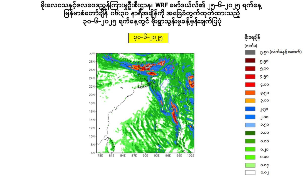 ၂၀၂၅ ခုနှစ်၊ ဇွန်လ (၂၅) ရက်နေ့ မြန်မာစံတော်ချိန် (၁၉:၀၀) နာရီအချိန်တွင် မိုးလေဝသနှင့် ဇလဗေဒညွှန်ကြားမှုဦးစီးဌာနမှ “အထူးမိုးလေဝသသတင်း” ကို အောက်ပါအတိုင်း ထုတ်ပြန်ထားပါသည်-