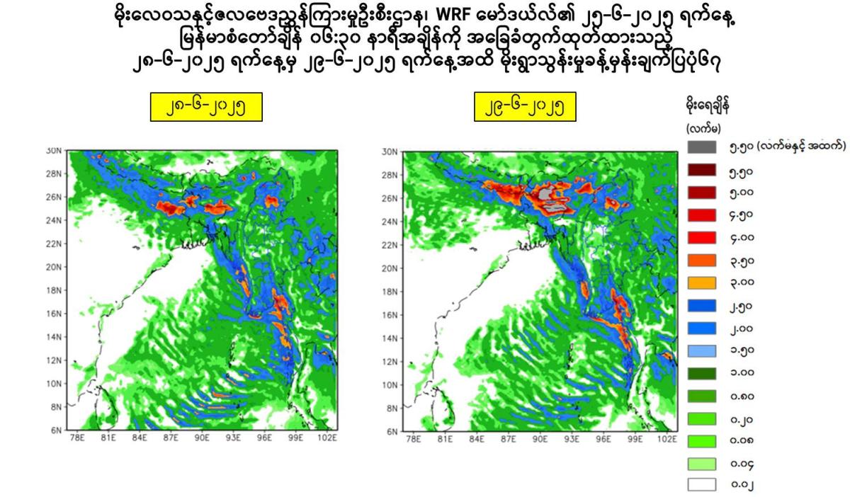 ယနေ့မြန်မာစံတော်ချိန် ၁၇:၃၀ နာရီအချိန် တိုင်းထွာချက်များအရ ကပ္ပလီပင်လယ်ပြင်နှင့် ဘင်္ဂလားပင်လယ်အော်တို့တွင် မုတ်သုံလေ အားကောင်းနေခြင်းကြောင့်လည်းကောင်း၊ အရှေ့ဘက်မှ ရွေ့လျားလာသော လေပွေလှိုင်းများ၏ အရှိန်ကြောင့်လည်းကောင်း၊ အနောက်ဘက်မှ ရွေ့လျားလာသော လေပွေလှိုင်းများ၏ အရှိန်ကြောင့်လည်းကောင်း ယနေ့ညမှ ၃၀-၆-၂၀၂၅ ရက်နေ့အတွင်း မန္တလေးတိုင်းဒေသကြီး၊ မကွေးတိုင်းဒေသကြီး၊ စစ်ကိုင်းတိုင်းဒေသကြီးအောက်ပိုင်းနှင့် ကယားပြည်နယ်တို့တွင် နေရာကျဲကျဲနှင့် နေပြည်တော်၊ ရန်ကုန်တိုင်းဒေသကြီး၊ ပဲခူးတိုင်းဒေသကြီး၊ စစ်ကိုင်းတိုင်းဒေသကြီး အထက်ပိုင်း၊ ဧရာဝတီတိုင်းဒေသကြီး၊ တနင်္သာရီတိုင်းဒေသကြီး၊ ကချင်ပြည်နယ်၊ ကရင်ပြည်နယ်၊ ချင်းပြည်နယ်၊ မွန်ပြည်နယ်၊ ရခိုင်ပြည်နယ်နှင့် ရှမ်းပြည်နယ်တို့တွင် နေရာစိပ်စိပ်မှ နေရာအနှံ့အပြား မိုးထစ်ချုန်းရွာပြီး၊ အချို့ဒေသများတွင် ဒေသအလိုက်နှင့် နေရာကွက်၍ မိုးကြီးမည်။ မြန်မာ့ကမ်းရိုးတန်းတစ်လျှောက်နှင့် ကမ်းလွန်ပင်လယ်ပြင်တို့တွင် ရံဖန်ရံခါ မိုးသက်လေပြင်းများကျရောက်ပြီး လှိုင်းကြီး မည်။ မိုးသက်လေပြင်းကျစဉ် ရေပြင်/မြေပြင်လေသည် တစ်နာရီလျှင် ၃၅ မိုင်အထိ တိုက်ခတ်နိုင်ပါသည်။ လှိုင်းအမြင့်မှာ မြန်မာ့ကမ်းရိုးတန်းတစ်လျှောက်နှင့် ကမ်းလွန်ပင်လယ်ပြင်တို့တွင် ၁၁ ပေမှ ၁၃ ပေခန့် ရှိနိုင်ပါသည်။