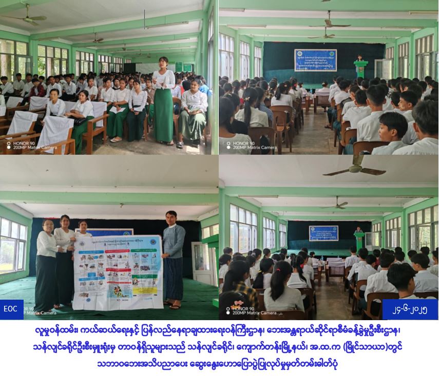 လူမှုဝန်ထမ်း၊ ကယ်ဆယ်ရေးနှင့်ပြန်လည်နေရာချထားရေးဝန်ကြီးဌာန၊ ဘေးအန္တရာယ်ဆိုင်ရာစီမံခန့်ခွဲမှုဦးစီးဌာန၊ သန်လျင်ခရိုင်ဦးစီးမှူးရုံးမှ တာဝန်ရှိသူများသည် (၂၄-၆-၂၀၂၅ )ရက်နေ့၊ နံနက် (၁၀:၀၀) နာရီအချိန်မှ (၁၁:၃၀) နာရီအချိန်အထိ ကျောက်တန်းမြို့နယ်၊ အ.ထ.က (မြိုင်သာယာ)တွင် ဆရာ၊ ဆရာမများနှင့် ကျောင်းသား/သူများ စုစုပေါင်း (၂၀၀) ဦးအား ငလျင်အသိပညာပေးဆွေးနွေးဟောပြောခြင်း၊ ဗွီနိုင်းပိုစတာများ၊ နံရံကပ်ပိုစတာများနှင့် လက်ကမ်းစာစောင်များ ပေးအပ်ခြင်းများ ဆောင်ရွက်ခဲ့ကြောင်း သတင်းရရှိပါသည်။
