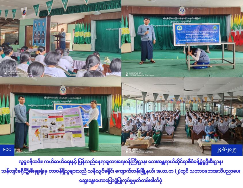 လူမှုဝန်ထမ်း၊ ကယ်ဆယ်ရေးနှင့်ပြန်လည်နေရာချထားရေးဝန်ကြီးဌာန၊ ဘေးအန္တရာယ်ဆိုင်ရာစီမံ ခန့်ခွဲမှုဦးစီးဌာန၊ သန်လျင်ခရိုင်ဦးစီးမှူးရုံးမှ တာဝန်ရှိသူများသည် (၂၄-၆-၂၀၂၅ )ရက်နေ့၊ နံနက် (၁၂:၃၀) နာရီအချိန်မှ (၁၃:၄၀) နာရီအချိန်အထိ သန်လျင်ခရိုင်၊ ကျောက်တန်းမြို့နယ်၊ အ.ထ.က (၂) တွင် ဆရာ၊ ဆရာမများနှင့် ကျောင်းသား/သူများ စုစုပေါင်း (၃၀၀) ဦးအား ငလျင်အသိပညာပေး ဆွေးနွေးဟောပြောခြင်း၊ ဗွီနိုင်းပိုစတာများ၊ နံရံကပ်ပိုစတာများနှင့် လက်ကမ်းစာစောင်များ ပေးအပ်ခြင်းများ ဆောင်ရွက်ခဲ့ကြောင်း သတင်းရရှိပါသည်။