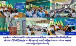 လူမှုဝန်ထမ်း၊ ကယ်ဆယ်ရေးနှင့်ပြန်လည်နေရာချထားရေးဝန်ကြီးဌာန၊ ဘေးအန္တရာယ်ဆိုင်ရာစီမံခန့်ခွဲမှု ဦးစီးဌာန၊ ရန်ကုန်တောင်ပိုင်းခရိုင်ဦးစီးမှူးရုံး(သန်လျင်) မှ တာဝန်ရှိသူများသည် (၃၀-၆-၂၀၂၅) ရက်နေ့ (၀၉:၀၀) နာရီအချိန်မှ (၁၀:၃၀)နာရီအချိန်အထိ သန်လျင်ခရိုင်၊ ကျောက်တန်းမြို့နယ်၊ အ.ထ.က (တံတား) ကျောင်းတွင်ဆရာ/ဆရာမ (၁၀)ဦး၊ ကျောင်းသား/သူ (၃၀၀) ဦးတို့နှင့်အတူ ငလျင်ဘေး အန္တရာယ်ဆိုင်ရာ Talk Show ဆောင်ရွက်ခဲ့ကြောင်း သတင်းရရှိပါသည်။