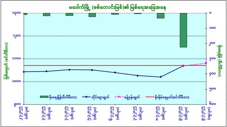 ယနေ့မြန်မာစံတော်ချိန် ၀၆:၃၀ နာရီအချိန် တိုင်းထွာချက်အရ စစ်တောင်းမြစ်ရေသည် မဒေါက်မြို့တွင် ယင်းမြို့၏ စိုးရိမ်ရေမှတ်အောက် ၁ စင်တီမီတာခန့်တွင် ရောက်ရှိနေပါသည်။ အဆိုပါမြစ်ရေသည် နောက် ၃ နာရီအတွင်း ယင်းမြို့၏ စိုးရိမ်ရေမှတ်သို့ ကျော်လွန်ရောက်ရှိနိုင်ပါသည်။