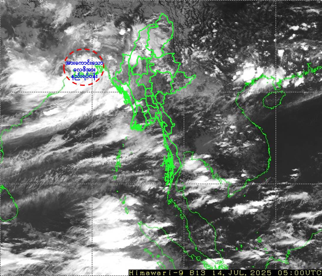 ၂၀၂၅ ခုနှစ်၊ ဇူလိုင်လ (၁၄) ရက်နေ့၊ မြန်မာစံတော်ချိန် (၁၂:၃၀) နာရီအချိန်တွင် မိုးလေဝသနှင့် ဇလဗေဒညွှန်ကြားမှုဦးစီးဌာနမှ “အားကောင်းသောလေဖိအားနည်းရပ်ဝန်းအခြေအနေ” ကို အောက်ပါအတိုင်း ထုတ်ပြန်ထားပါသည်-