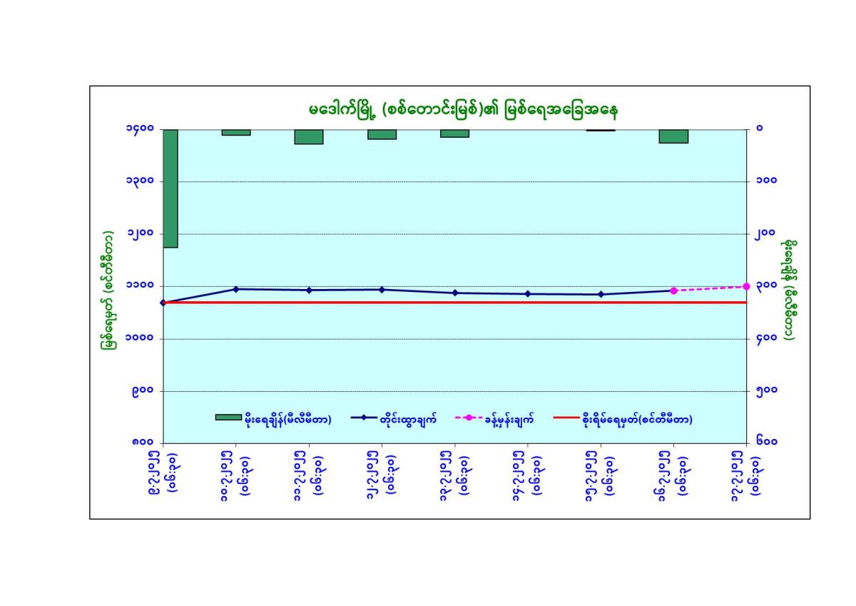 ယနေ့မြန်မာစံတော်ချိန် ၀၆:၃၀ နာရီအချိန် တိုင်းထွာချက်အရ စစ်တောင်းမြစ်ရေသည် မဒေါက်မြို့တွင် ယင်းမြို့၏ စိုးရိမ်ရေမှတ်အထက်သို့ ပေဝက်ကျော် ကျော်လွန်နေပြီး နောက် ၁ ရက်အတွင်း ၃ လက်မခန့် မြင့်တက်လာနိုင်ကာ ယင်းမြို့၏ စိုးရိမ်ရေမှတ်အထက် ဆက်လက်တည်ရှိနိုင်ပါသည်။