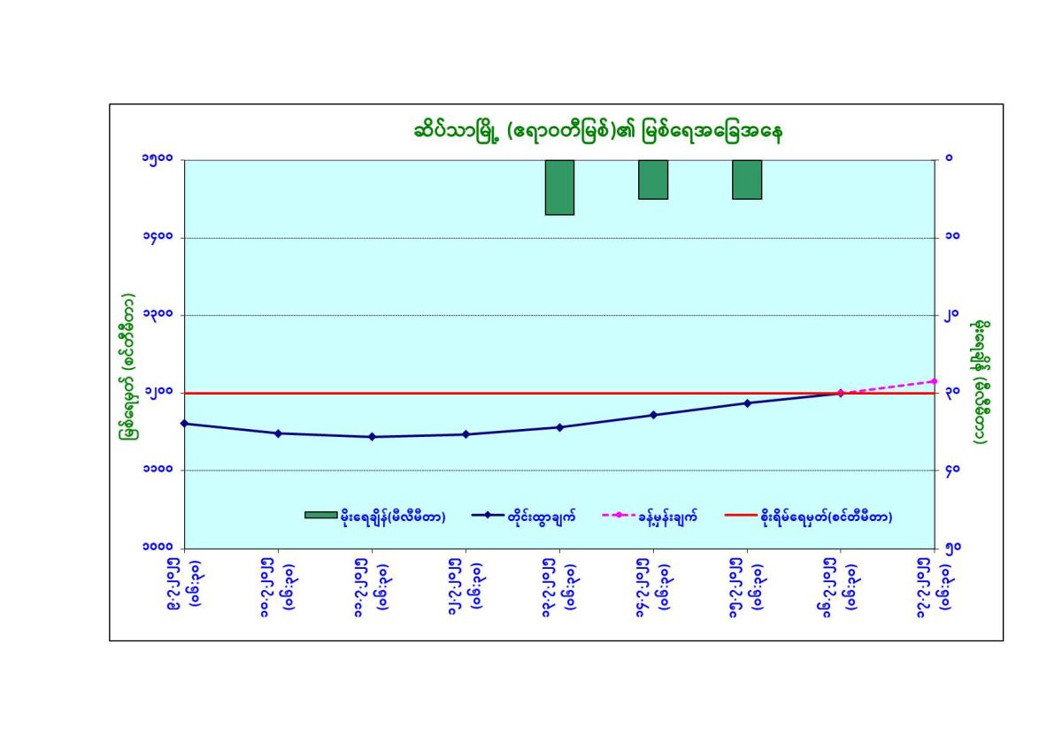 ယနေ့မြန်မာစံတော်ချိန် ၀၆:၃၀ နာရီအချိန် တိုင်းထွာချက်အရ ဧရာဝတီမြစ်ရေသည် ဆိပ်သာ မြို့တွင် ယင်းမြို့၏ စိုးရိမ်ရေမှတ်သို့ ရောက်ရှိနေပြီး နောက် ၁ ရက်အတွင်း ပေဝက်ခန့် မြင့်တက်လာနိုင်ကာ ယင်းမြို့၏ စိုးရိမ်ရေအထက်သို့ ဆက်လက်တည်ရှိနိုင်ပါသည်။