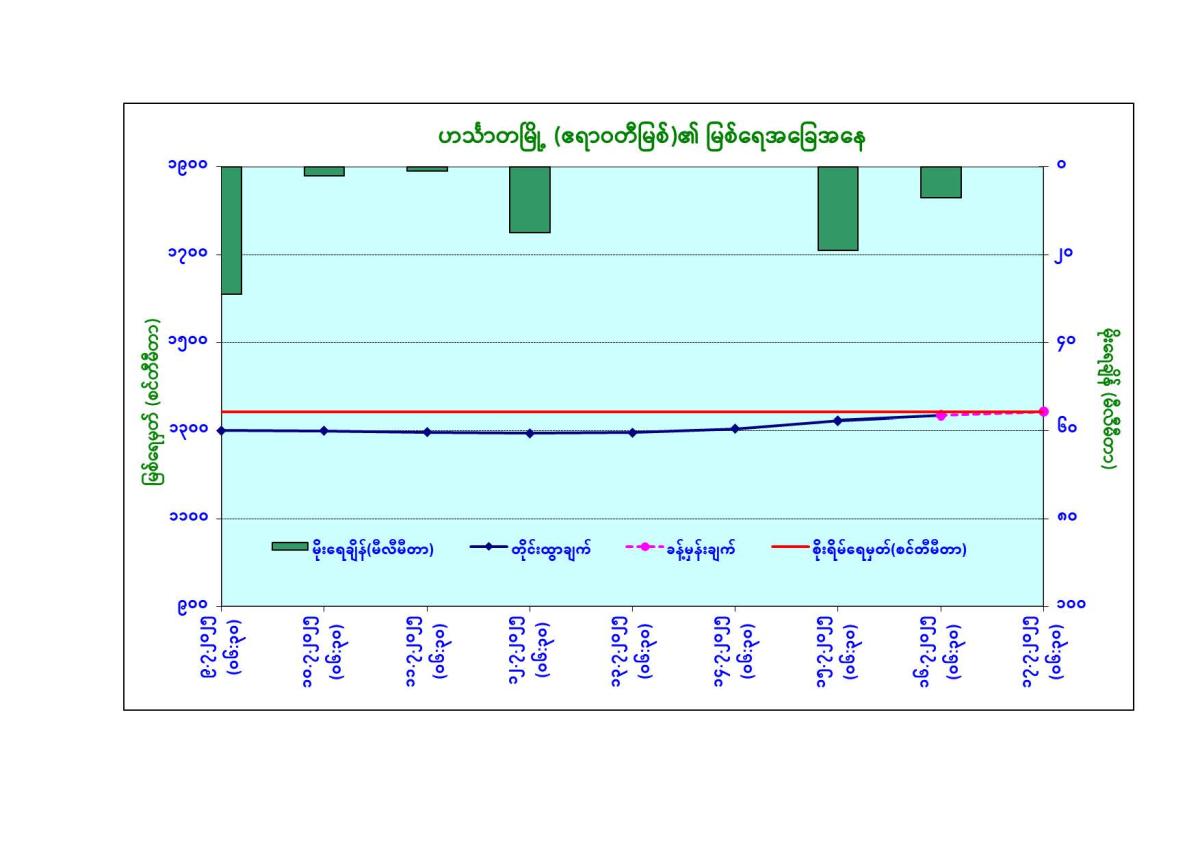 ယနေ့မြန်မာစံတော်ချိန် ၀၆:၃၀ နာရီအချိန် တိုင်းထွာချက်အရ ဧရာဝတီမြစ်ရေသည် ဟင်္သာတမြို့တွင် ယင်းမြို့၏ စိုးရိမ်ရေမှတ်အောက် ပေဝက်ခန့်တွင် ရောက်ရှိနေပါသည်။ အဆိုပါမြစ်ရေသည် နောက် ၁ ရက်အတွင်း ယင်းမြို့၏ စိုးရိမ်ရေမှတ်သို့ ရောက်ရှိနိုင်ပါသည်။