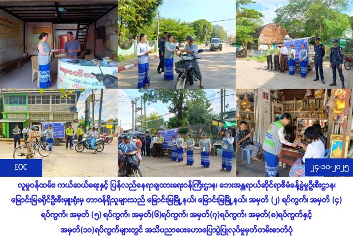 လူမှုဝန်ထမ်း၊ ကယ်ဆယ်ရေးနှင့်ပြန်လည်နေရာချထားရေးဝန်ကြီးဌာန၊ ဘေးအန္တရာယ်ဆိုင်ရာစီမံခန့်ခွဲမှု ဦးစီးဌာန၊ မြောင်းမြခရိုင်ဦးစီးမှူးရုံးနှင့် ဝါးခယ်မမြို့နယ်ဦးစီးမှူးရုံးတို့မှ တာဝန်ရှိသူများသည် (၂၄-၁၀-၂၀၂၅) ရက်နေ့တွင် မြောင်းမြမြို့နယ်၊ အမှတ် (၂) ရပ်ကွက်၊ အမှတ် (၄) ရပ်ကွက်၊ အမှတ် (၅) ရပ်ကွက်၊ အမှတ် (၆) ရပ်ကွက်၊ အမှတ် (၇) ရပ်ကွက်၊ အမှတ်(၈)ရပ်ကွက်နှင့် အမှတ်(၁၀)ရပ်ကွက်များ၌ သဘာဝဘေးအန္တရာယ် ဆိုင်ရာ အသိပညာပေးဆောင်ရန်/ရှောင်ရန်အချက်များအား ရပ်ကွက်ကျေးရွာနေ ပြည်သူများသိရှိစေရန် အတွက် လိုက်လံနှိုးဆော်အသိပညာပေးခြင်းနှင့် လက်ကမ်းစာစောင်ဖြန့်ဝေပေးခြင်းများအား ဆောင်ရွက် ခဲ့ကြောင်း သတင်းရရှိပါသည်။