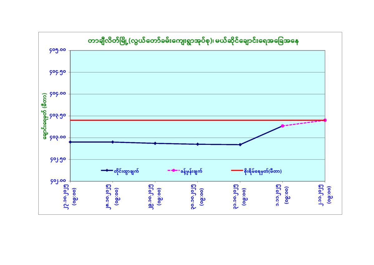 ယနေ့မြန်မာစံတော်ချိန် ၀၉:၀၀ နာရီအချိန် တိုင်းထွာချက်အရ မယ်ဆိုင်ချောင်းရေသည် တာချီလိတ်မြို့(လွယ်တော်ခမ်းကျေးရွာ)တွင် ယင်းမြို့၏စိုးရိမ်ရေမှတ်အောက် ပေဝက်ခန့်တွင် ရောက်ရှိ နေပါသည်။ အဆိုပါချောင်းရေသည် နောက် ၁ ရက်အတွင်း ယင်းမြို့၏ စိုးရိမ်ရေမှတ်သို့ ရောက်ရှိနိုင် ပါသည်။