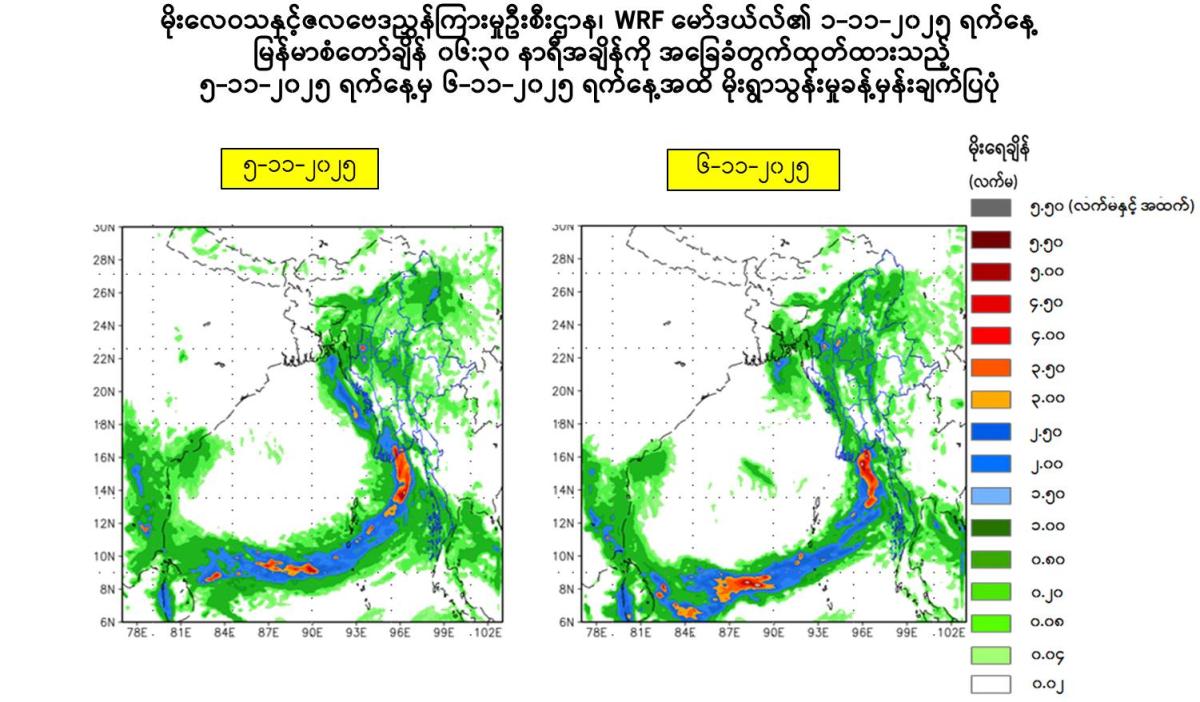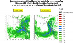 (က) ယနေ့မြန်မာစံတော်ချိန် ၁၅:၃၀ နာရီအချိန် တိုင်းထွာချက်များအရ အရှေ့ဘက်မှ ရွေ့လျား လာသော လေပွေလှိုင်းများ၏အရှိန်ကြောင့်လည်းကောင်း၊ ဘင်္ဂလားပင်လယ်အော်အရှေ့အလယ်ပိုင်း နှင့်ယင်းနှင့်ဆက်စပ်လျက်ရှိသော မြန်မာနိုင်ငံ၊ မြစ်ဝကျွန်းပေါ်ကမ်းရိုးတန်းဒေသအနီးတွင် ဖြစ်ပေါ်နေ သော လေဖိအားနည်းရပ်ဝန်း၏အရှိန်ကြောင့်လည်းကောင်း၊ အထက်ပင့်တက်လေအားကောင်းရာမှ ဒေါင်လိုက် တိမ်ဖြစ်ထွန်းမှုအားကောင်းသည့်အတွက် မိုးတိမ်တောင်များဖြစ်ပေါ်ခြင်းကြောင့် လည်းကောင်း ၃-၁၁-၂၀၂၅ ရက်နေ့မှ ၆-၁၁-၂၀၂၅ ရက်နေ့အတွင်း နေပြည်တော်၊ ရန်ကုန်တိုင်း ဒေသကြီး၊ မန္တလေးတိုင်းဒေသကြီး၊ ပဲခူးတိုင်းဒေသကြီး၊ မကွေးတိုင်းဒေသကြီး၊ စစ်ကိုင်းတိုင်းဒေသကြီး၊ ဧရာဝတီတိုင်းဒေသကြီး၊ တနင်္သာရီတိုင်းဒေသကြီး၊ ကချင်ပြည်နယ်၊ ကယားပြည်နယ်၊ ကရင်ပြည်နယ်၊ ချင်းပြည်နယ်၊ မွန်ပြည်နယ်၊ ရခိုင်ပြည်နယ်နှင့် ရှမ်းပြည်နယ်တို့တွင် နေရာစိပ်စိပ်မှ နေရာအနှံ့အပြား မိုးထစ်ချုန်းရွာပြီး အချို့ဒေသများတွင် ဒေသအလိုက်နှင့် နေရာကွက်၍ မိုးကြီးခြင်းများ ဖြစ်ပေါ်နိုင်ပါ သည်။