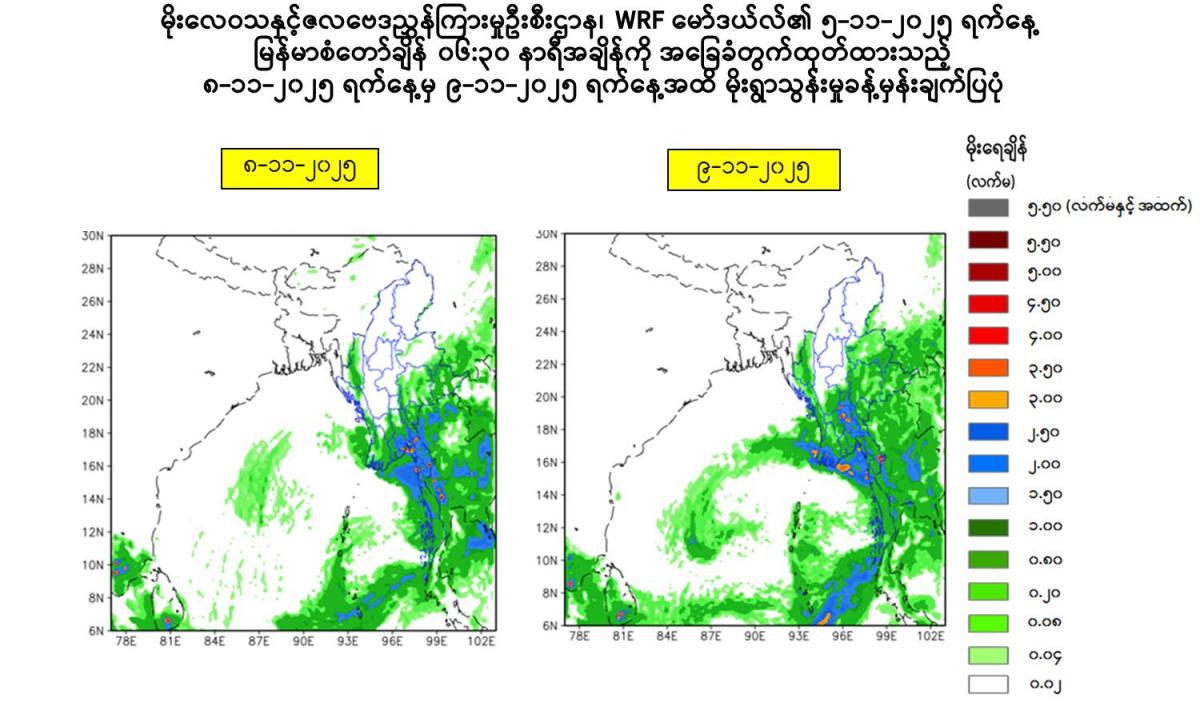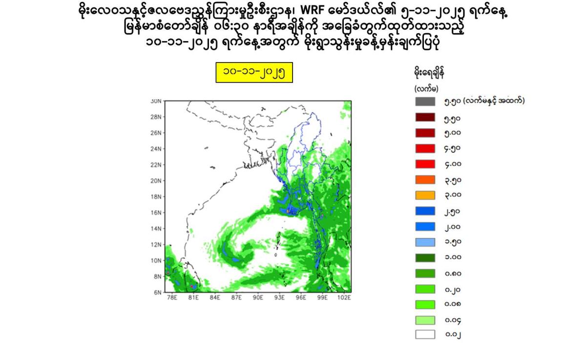 သို့ဖြစ်ပါ၍ မိုးသည်းထန်စွာရွာသွန်းခြင်းနှင့်အတူ လေပြင်းတိုက်ခတ်ခြင်း၊ မိုးထစ်ချုန်းခြင်း၊ မိုးကြိုးပစ်ခြင်း၊ လျှပ်စီးလက်ခြင်း၊ မိုးသီးကြွေခြင်း၊ လျှပ်တစ်ပြက်ရေကြီးခြင်းနှင့် မြေပြိုခြင်းစသည့် သဘာဝဘေး အန္တရာယ်များ ဖြစ်ပေါ်နိုင်ပါသဖြင့် အဆိုပါဒေသများရှိ ကုန်းမြင့်ဒေသအနီးတွင် နေထိုင်ကြသူများအနေဖြင့် မြေပြိုမှုအန္တရာယ်၊ မြစ်ငယ်၊ ချောင်းငယ်များအနီးတွင် နေထိုင်ကြသူများအနေဖြင့် ရေကြီး၊ ရေလျှံမှုများကို ကြိုတင်သတိပြုရှောင်ရှားနိုင်ပါရန်နှင့် ပြည်တွင်းရေကြောင်းသွားလာရေး၊ လေကြောင်းပျံသန်းရေးနှင့် ဆည်မြောင်းတာတမံများအနေဖြင့် လိုအပ်သည်များ ကြိုတင်ပြင်ဆင် ဆောင်ရွက်ထားနိုင်ပါရန် သတိပေးနှိုးဆော်အပ်ပါသည်။
