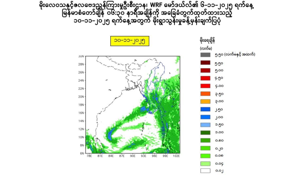 သို့ဖြစ်ပါ၍ မိုးသည်းထန်စွာရွာသွန်းခြင်းနှင့်အတူ လေပြင်းတိုက်ခတ်ခြင်း၊ မိုးထစ်ချုန်းခြင်း၊ မိုးကြိုးပစ်ခြင်း၊ လျှပ်စီးလက်ခြင်း၊ မိုးသီးကြွေခြင်း၊ လျှပ်တစ်ပြက်ရေကြီးခြင်းနှင့် မြေပြိုခြင်းစသည့် သဘာဝဘေးအန္တရာယ်များ ဖြစ်ပေါ်နိုင်ပါသဖြင့် အဆိုပါဒေသများရှိ ကုန်းမြင့်ဒေသအနီးတွင် နေထိုင် ကြသူများအနေဖြင့် မြေပြိုမှုအန္တရာယ်၊ မြစ်ငယ်၊ ချောင်းငယ်များအနီးတွင် နေထိုင်ကြသူများ အနေဖြင့် ရေကြီး၊ ရေလျှံမှုများကို ကြိုတင်သတိပြုရှောင်ရှားနိုင်ပါရန်နှင့် ပြည်တွင်းရေကြောင်း သွားလာရေး၊ လေကြောင်းပျံသန်းရေးနှင့် ဆည်မြောင်းတာတမံများအနေဖြင့် လိုအပ်သည်များ ကြိုတင်ပြင်ဆင်ဆောင်ရွက်ထားနိုင်ပါရန် သတိပေးနှိုးဆော်အပ်ပါသည်။