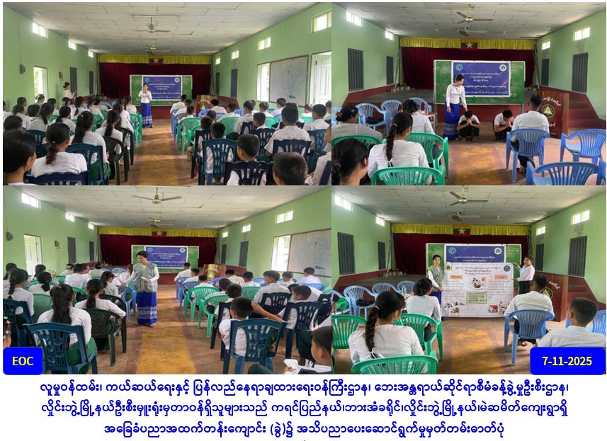 လူမှုဝန်ထမ်း၊ ကယ်ဆယ်ရေးနှင့်ပြန်လည်နေရာချထားရေးဝန်ကြီးဌာန၊ ဘေးအန္တရာယ်ဆိုင်ရာစီမံခန့်ခွဲမှုဦးစီးဌာန၊ ဘားအံခရိုင်၊ လှိုင်းဘွဲ့မြို့နယ်ဦးစီးမှူးရုံးမှတာဝန်ရှိသူများသည် (၇-၁၁-၂၀၂၅)ရက်နေ့၊ (၁၀း၀၀) နာရီအချိန်မှ (၁၂း၀၀)နာရီအချိန်အထိ လှိုင်းဘွဲ့မြို့နယ်၊ မဲဆမိတ်ကျေးရွာရှိ အခြေခံပညာအထက်တန်း ကျောင်း (ခွဲ)တွင် ကျောင်းသား/ကျောင်းသူ စုစုပေါင်း (၁၅၀)ဦး တို့အား သဘာဝဘေးအန္တရာယ်များနှင့်ပတ်သက်၍ ဆောင်ရန်/ ရှောင်ရန်များအား အသိပညာပေးဟောပြောဆွေးနွေးခြင်း၊ လက်ကမ်းစာစောင်များဝေငှပေးခြင်းနှင့် မီးဘေးအသိပညာပေး ဗီနိုင်းပိုစတာ(၁)ချပ် ပေးအပ်ခဲ့ခြင်းများ ဆောင်ရွက်ခဲ့ပါကြောင်း သတင်းရရှိပါသည်။