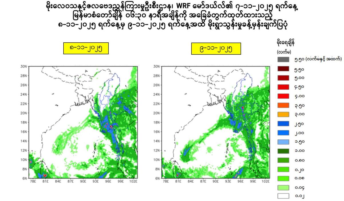 သို့ဖြစ်ပါ၍ မိုးသည်းထန်စွာရွာသွန်းခြင်းနှင့်အတူ လေပြင်းတိုက်ခတ်ခြင်း၊ မိုးထစ်ချုန်းခြင်း၊ မိုးကြိုးပစ်ခြင်း၊ လျှပ်စီးလက်ခြင်း၊ မိုးသီးကြွေခြင်း၊ လျှပ်တစ်ပြက်ရေကြီးခြင်းနှင့် မြေပြိုခြင်းစသည့် သဘာဝဘေးအန္တရာယ်များ ဖြစ်ပေါ်နိုင်ပါသဖြင့် အဆိုပါဒေသများရှိ ကုန်းမြင့်ဒေသအနီးတွင် နေထိုင်ကြသူများအနေဖြင့် မြေပြိုမှုအန္တရာယ်၊ မြစ်ငယ်၊ ချောင်းငယ်များအနီးတွင် နေထိုင်ကြသူများအနေဖြင့် ရေကြီး၊ ရေလျှံမှုများကို ကြိုတင်သတိပြုရှောင်ရှားနိုင်ပါရန်နှင့် ပြည်တွင်းရေကြောင်းသွားလာရေး၊ လေကြောင်းပျံသန်းရေးနှင့် ဆည်မြောင်းတာတမံများအနေဖြင့် လိုအပ်သည်များ ကြိုတင်ပြင်ဆင်ဆောင်ရွက်ထားနိုင်ပါရန် သတိပေးနှိုးဆော်အပ်ပါသည်။