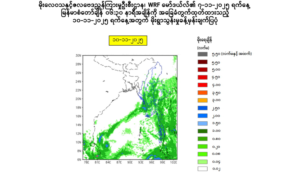 အဆိုပါ လေဖိအားနည်းရပ်ဝန်းမှ ပြတ်ထွက်လာသော တိမ်တိုက်များကြောင့် ယနေ့ညနေမှ ၁၀-၁၁-၂၀၂၅ ရက်နေ့အတွင်း နေပြည်တော်၊ ရန်ကုန်တိုင်းဒေသကြီး၊ ပဲခူးတိုင်းဒေသကြီး၊ ဧရာဝတီ တိုင်းဒေသကြီး၊ တနင်္သာရီတိုင်းဒေသကြီး၊ ကယားပြည်နယ်၊ ကရင်ပြည်နယ်၊ မွန်ပြည်နယ်၊ ရခိုင် ပြည်နယ်နှင့် ရှမ်းပြည်နယ်(တောင်ပိုင်းနှင့် အရှေ့ပိုင်း) တို့တွင် နေရာစိပ်စိပ်မှ နေရာအနှံ့အပြား မိုးထစ်ချုန်းရွာပြီး အချို့ဒေသများတွင် ဒေသအလိုက်နှင့် နေရာကွက်၍ မိုးကြီးခြင်းများ ဖြစ်ပေါ်နိုင်ပါသည်။ မြစ်ဝကျွန်းပေါ်၊ မုတ္တမကွေ့၊ မွန်-တနင်္သာရီကမ်းရိုးတန်းတစ်လျှောက်နှင့် ကမ်းလွန်ပင်လယ်ပြင်တို့တွင် တစ်ခါတစ်ရံ မိုးသက်လေပြင်းများကျရောက်ပြီး လှိုင်းအသင့်အတင့်မှ လှိုင်းကြီးနိုင်ပါသည်။ မိုးသက်လေပြင်းကျစဉ် ရေပြင်/မြေပြင်လေသည် တစ်နာရီလျှင် ၂၅ မိုင်မှ မိုင် ၃၀ အထိ တိုက်ခတ်နိုင်ပါသည်။ လှိုင်းအမြင့်မှာ မြစ်ဝကျွန်းပေါ်၊ မုတ္တမကွေ့၊ မွန်-တနင်္သာရီကမ်းရိုးတန်း တစ်လျှောက်နှင့် ကမ်းလွန်ပင်လယ်ပြင်တို့တွင် ၈ ပေမှ ၁၀ ပေခန့်ရှိနိုင်ပါသည်။