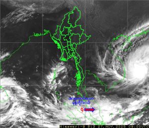 ၂၀၂၅ ခုနှစ်၊ နိုဝင်ဘာလ ၂၇ ရက်နေ့ မြန်မာစံတော်ချိန် (၁၆:၀၀) နာရီအချိန်တွင် မိုးလေဝသနှင့် ဇလဗေဒညွှန်ကြားမှုဦးစီးဌာနမှ “အားကောင်းသောမုန်တိုင်းငယ်သတင်း အမှတ်စဉ် (၀၇/၂၀၂၅)”ကို အောက်ပါအတိုင်း ထုတ်ပြန်ထားပါသည်-