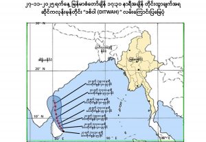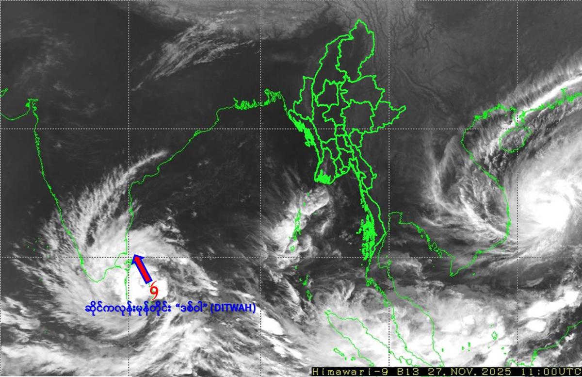 (၁) ယနေ့မြန်မာစံတော်ချိန် ၁၇:၃၀ နာရီအချိန် တိုင်းထွာချက်များအရ ဘင်္ဂလားပင်လယ်အော် အနောက်တောင်ပိုင်းနှင့် ယင်းနှင့်ဆက်စပ်လျက်ရှိသော သီရိလင်္ကာနိုင်ငံကမ်းခြေတို့တွင် ဖြစ်ပေါ်နေသော အားကောင်းသောမုန်တိုင်းငယ် (Deep Depression) သည် မြောက်-အနောက်မြောက်ဘက်သို့ ရွေ့လျားခဲ့ပြီး ပိုမိုအားကောင်းလာကာ ဆိုင်ကလုန်းမုန်တိုင်း “ဒစ်ဝါ” (DITWAH) အဖြစ်သို့ ရောက်ရှိခဲ့ပါသည်။ အဆိုပါ ဆိုင်ကလုန်းမုန်တိုင်း “ဒစ်ဝါ”သည် မြန်မာနိုင်ငံ၊ ကိုကိုးကျွန်းမြို့ (Coco Island) ၏ အနောက်တောင်ဘက် ရေမိုင် ၈၀၀ မိုင်ခန့်၊ သီရိလင်္ကာနိုင်ငံ၊ ထရီကိုမာလီမြို့ (Tricomalee) ၏ တောင်-အရှေ့တောင်ဘက် ရေမိုင် ၁၁၀ မိုင်ခန့်နှင့် အိန္ဒိယနိုင်ငံ၊ ပူဒူချယ်ရီမြို့ (Puducherry)၏ တောင်-အရှေ့တောင်ဘက် ရေမိုင် ၃၃၀ မိုင်ခန့်အကွာ ပင်လယ်ပြင်ကို ဗဟိုပြုနေပါသည်။