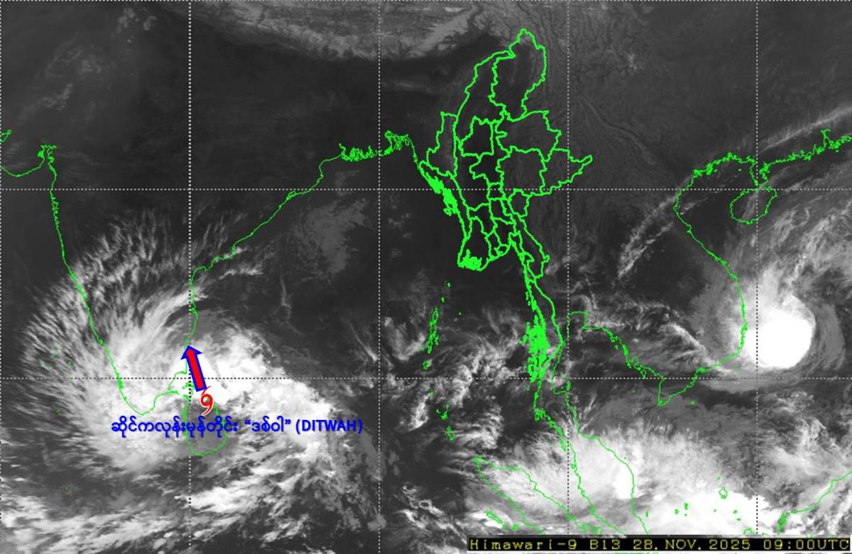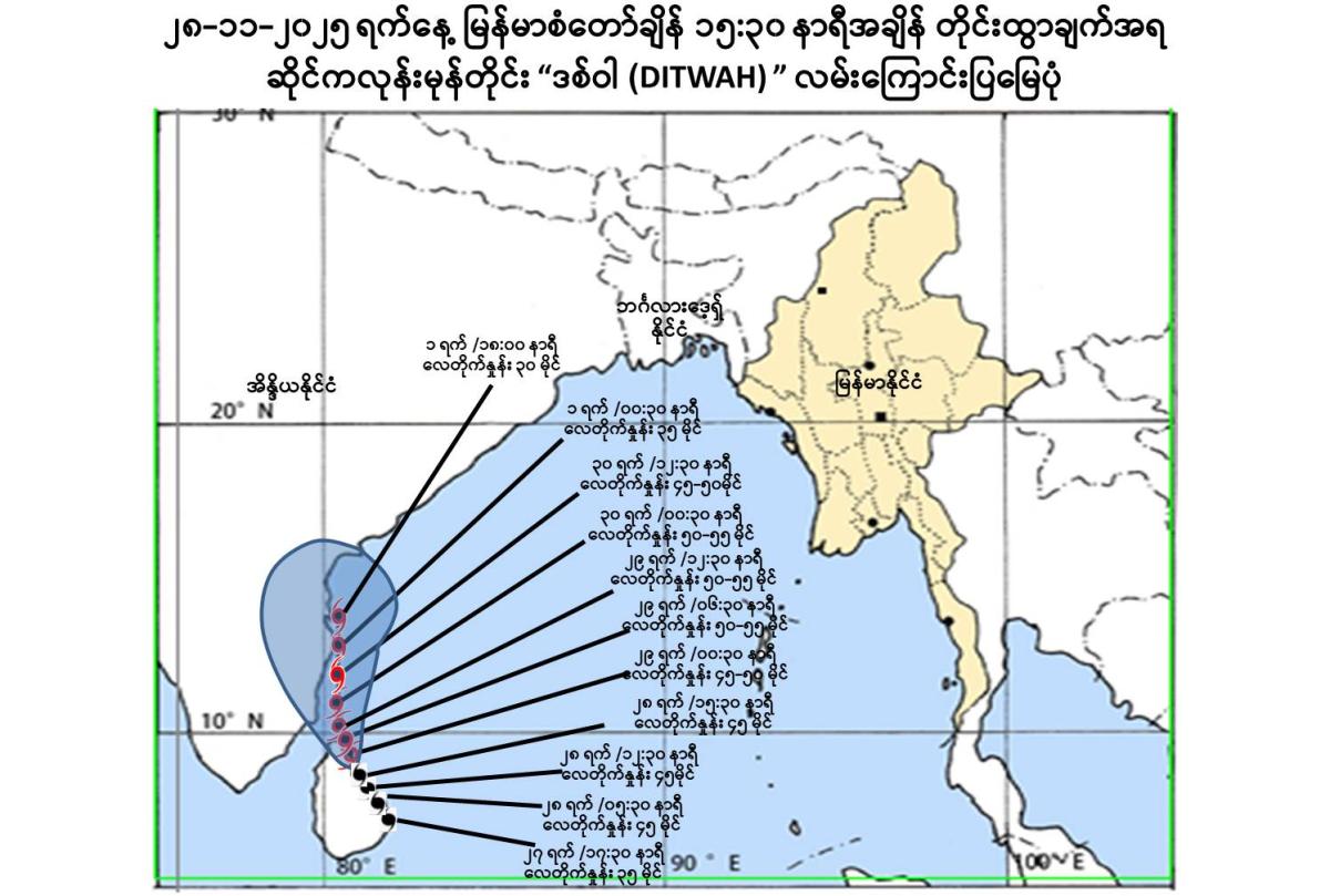 (၁) ယနေ့မြန်မာစံတော်ချိန် ၁၅:၃၀ နာရီအချိန် တိုင်းထွာချက်များအရ ဘင်္ဂလားပင်လယ်အော် အနောက်တောင်ပိုင်းနှင့် ယင်းနှင့်ဆက်စပ်လျက်ရှိသော သီရိလင်္ကာနိုင်ငံကမ်းခြေတို့တွင် ဖြစ်ပေါ် နေသော ဆိုင်ကလုန်းမုန်တိုင်း“ဒစ်ဝါ”(DITWAH) သည် မြောက်-အနောက်မြောက်ဘက်သို့ ရွေ့လျားခဲ့ပြီး သီရိလင်္ကာနိုင်ငံ၊ ထရီကိုမာလီမြို့ (Tricomalee)အနီးကို ဖြတ်ကျော်လျက်ရှိပါသည်။ အဆိုပါ ဆိုင်ကလုန်းမုန်တိုင်း “ဒစ်ဝါ”သည် မြန်မာနိုင်ငံ၊ ကိုကိုးကျွန်းမြို့ (Coco Island) ၏ အနောက်-အနောက် တောင်ဘက် ရေမိုင် ၈၀၅ မိုင်ခန့်နှင့် အိန္ဒိယနိုင်ငံ၊ ပူဒူချယ်ရီမြို့(Puducherry) ၏ တောင်-အရှေ့တောင်ဘက် ရေမိုင် ၂၂၅ မိုင်ခန့်အကွာ ပင်လယ်ပြင်ကို ဗဟိုပြုနေပါသည်။