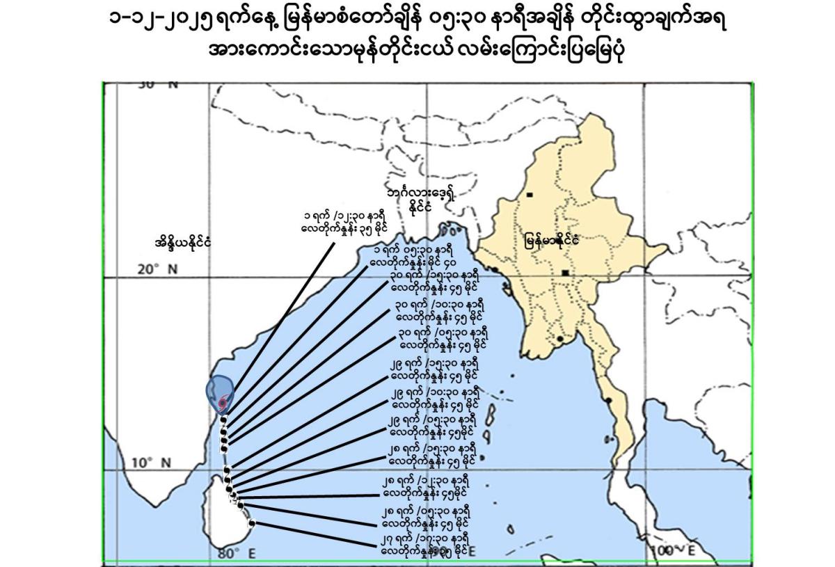(၁) ယနေ့မြန်မာစံတော်ချိန် ၀၅:၃၀ နာရီအချိန် တိုင်းထွာချက်များအရ ဘင်္ဂလားပင်လယ်အော် အနောက်တောင်ပိုင်းနှင့် ယင်းနှင့်ဆက်စပ်လျက်ရှိသော အိန္ဒိယနိုင်ငံ၊ တမီးလ်နာဒူး-ပူဒူချယ်ရီကမ်းခြေတို့တွင် ဖြစ်ပေါ်နေသော ဆိုင်ကလုန်းမုန်တိုင်း “ဒစ်ဝါ” (DITWAH) သည် မြောက်ဘက်သို့ ရွေ့လျားခဲ့ပြီး အားကောင်းသောမုန်တိုင်းငယ် (Deep Depression) အဖြစ် အားလျော့သွားခဲ့ကာ မြန်မာနိုင်ငံ၊ ကိုကိုးကျွန်းမြို့(Coco Island)၏ အနောက်-အနောက်တောင်ဘက် ရေမိုင် ၇၅၀ မိုင်ခန့်၊ အိန္ဒိယနိုင်ငံ၊ ပူဒူချယ်ရီမြို့(Puducherry)၏ အရှေ့မြောက်ဘက် ရေမိုင် ၅၅ မိုင်ခန့်နှင့် ချင်းနိုင်မြို့ (Chennai)၏ တောင်-အရှေ့တောင်ဘက် ရေမိုင် ၄၀ မိုင်ခန့်အကွာ ပင်လယ်ပြင်ကို ဗဟိုပြုနေပါသည်။