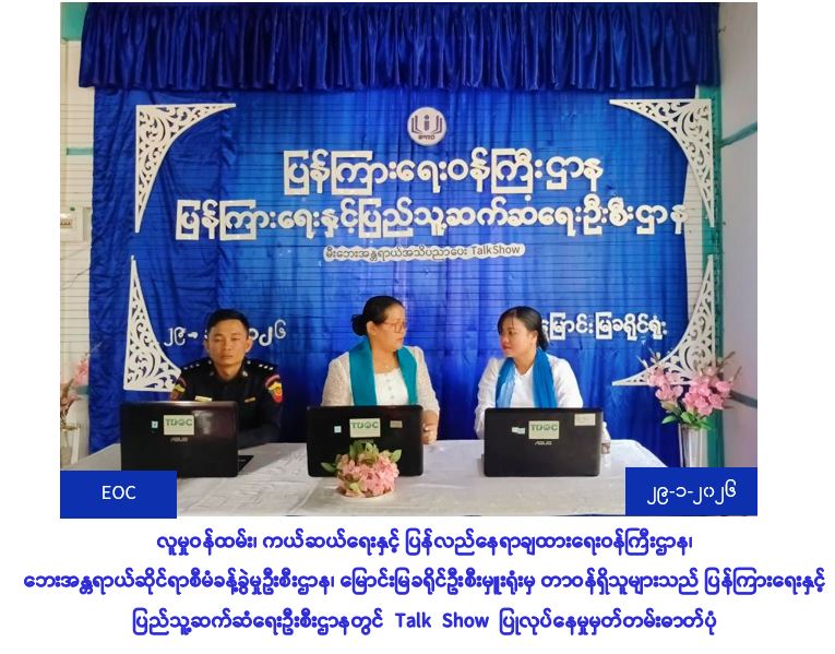 လူမှုဝန်ထမ်း၊ ကယ်ဆယ်ရေးနှင့်ပြန်လည်နေရာချထားရေးဝန်ကြီးဌာန၊ ဘေးအန္တရာယ်ဆိုင်ရာစီမံခန့်ခွဲမှု ဦးစီးဌာန၊ မြောင်းမြခရိုင်ဦးစီးမှူးရုံးမှ တာဝန်ရှိသူများသည် (၂၉- ၁ -၂၀၂၆ )ရက်နေ့ (၁၄:၀၀)နာရီအချိန်မှ (၁၅:၀၀)နာရီအချိန်ထိ ပြန်ကြားရေးနှင့် ပြည်သူ့ဆက်ဆံရေးဦးစီးဌာနတွင် သဘာဝဘေးအသိပညာပေး ဟောပြောပွဲ Talk Show အစီအစဉ်အား မီးသတ်ဦးစီးဌာနနှင့် ပူးပေါင်း၍ ဆောင်ရွက်ခဲ့ပါကြောင်း သတင်းရရှိပါ သည်။