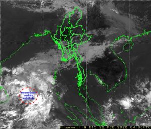 ၂၀၂၆ ခုနှစ်၊ ဖေဖော်ဝါရီလ ၂၂ ရက်နေ့ မြန်မာစံတော်ချိန် (၁၂:၀၀) နာရီအချိန်တွင် မိုးလေဝသနှင့် ဇလဗေဒညွှန်ကြားမှုဦးစီးဌာနမှ “အားကောင်းသောလေဖိအားနည်းရပ်ဝန်းအခြေအနေ” ကို အောက်ပါအတိုင်း ထုတ်ပြန်ထားပါသည်-