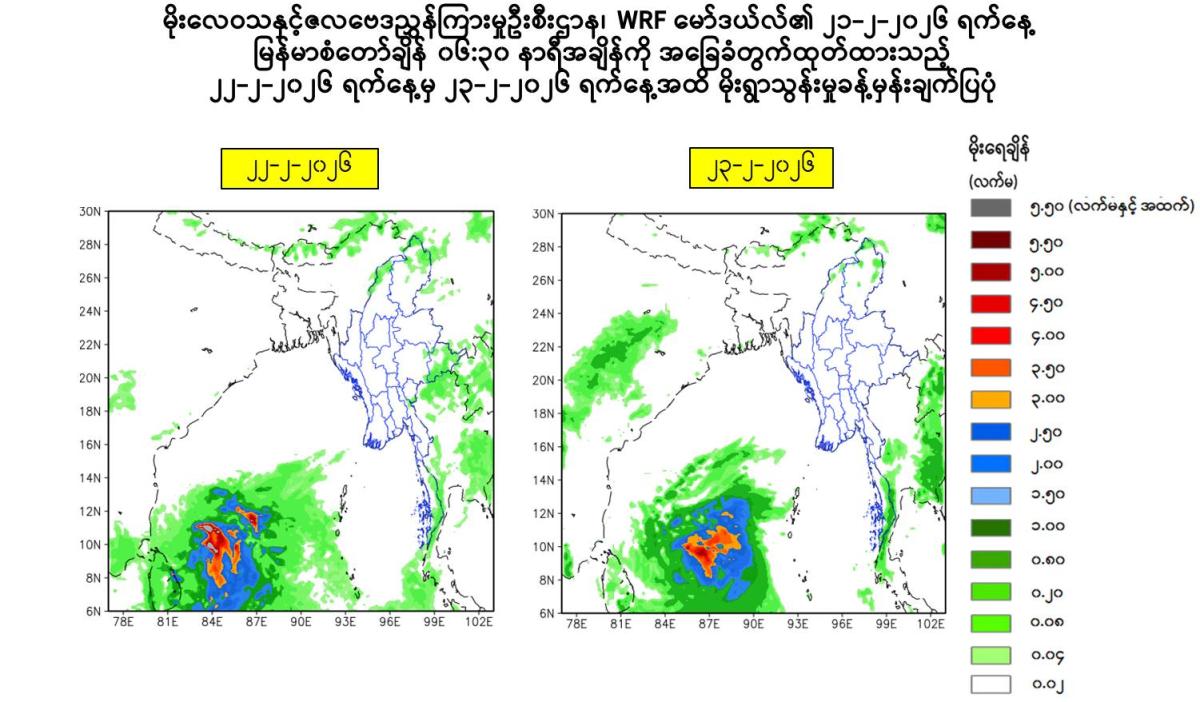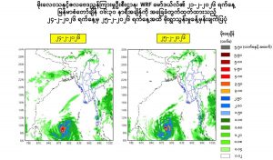 (က) ယနေ့မြန်မာစံတော်ချိန် ၁၀:၃၀ နာရီအချိန် တိုင်းထွာချက်များအရ အီကွေတာအနီး အိန္ဒိယ သမုဒ္ဒရာနှင့် ယင်းနှင့်ဆက်စပ်လျက်ရှိသော ဘင်္ဂလားပင်လယ်အော်အရှေ့တောင်ပိုင်းတို့တွင် ဖြစ်ပေါ်နေ သော လေဖိအားနည်းရပ်ဝန်း (Low Pressure Area) သည် အနောက်-အနောက်မြောက်ဘက်သို့ ရွေ့လျားခဲ့ပြီး ပိုမိုအားကောင်းလာကာ ဘင်္ဂလားပင်လယ်အော်အနောက်တောင်ပိုင်းတွင် အားကောင်း သောလေဖိအားနည်းရပ်ဝန်း (Well Marked Low Pressure Area) အဖြစ်သို့ ရောက်ရှိခဲ့ပါသည်။ အဆိုပါ အားကောင်းသောလေဖိအားနည်းရပ်ဝန်းသည် နောက် ၄၈ နာရီအတွင်း အနောက်-အနောက်မြောက် ဘက်သို့ ဆက်လက်ရွေ့လျားနိုင်သည်ဟု ခန့်မှန်းရပါသည်။