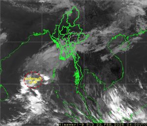 ၂၀၂၆ ခုနှစ်၊ ဖေဖော်ဝါရီလ ၂၃ ရက်နေ့ မြန်မာစံတော်ချိန် (၁၂:၀၀) နာရီအချိန်တွင် မိုးလေဝသနှင့် ဇလဗေဒညွှန်ကြားမှုဦးစီးဌာနမှ “လေဖိအားနည်းရပ်ဝန်းအခြေအနေ” ကို အောက်ပါအတိုင်း ထုတ်ပြန်ထားပါသည်-