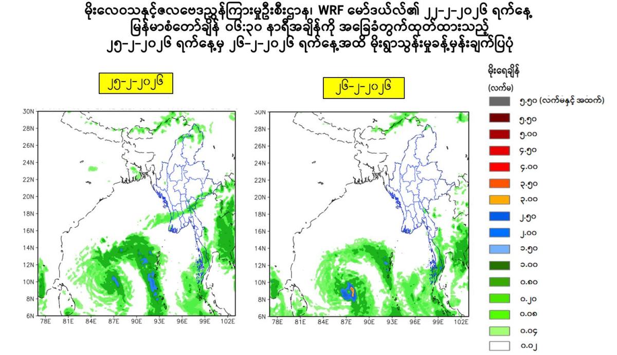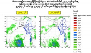 (က) ယနေ့မြန်မာစံတော်ချိန် ၁၀:၃၀ နာရီအချိန် တိုင်းထွာချက်များအရ ဘင်္ဂလားပင်လယ်အော် အနောက်တောင်ပိုင်းတွင် ဖြစ်ပေါ်နေသော အားကောင်းသောလေဖိအားနည်းရပ်ဝန်း (Well Marked Low Pressure Area) သည် အရှေ့မြောက်ဘက်သို့ ရွေ့လျားခဲ့ပြီး ဘင်္ဂလားပင်လယ်အော်အနောက် တောင်ပိုင်းနှင့်ယင်းနှင့်ဆက်စပ်လျက်ရှိသော ဘင်္ဂလားပင်လယ်အော်အလယ်ပိုင်းသို့ ရောက်ရှိခဲ့ကာ လေဖိအားနည်းရပ်ဝန်း (Low Pressure Area) အဖြစ်သို့ အားလျော့သွားခဲ့ပြီးဖြစ်ပါသည်။ အဆိုပါ လေဖိအားနည်းရပ်ဝန်းသည် နောက် ၂၄ နာရီအတွင်း အရှေ့မြောက်ဘက်သို့ ဆက်လက်ရွေ့လျားနိုင်ပြီး တဖြည်းဖြည်း အားလျော့သွားနိုင်သည်ဟု ခန့်မှန်းရပါသည်။