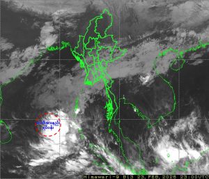 ၂၀၂၆ ခုနှစ်၊ ဖေဖော်ဝါရီလ ၂၄ ရက်နေ့ မြန်မာစံတော်ချိန် (၁၆:၀၀) နာရီအချိန်တွင် မိုးလေဝသနှင့် ဇလဗေဒညွှန်ကြားမှုဦးစီးဌာနမှ “လေဖိအားနည်းရပ်ဝန်းအခြေအနေ”ကို အောက်ပါအတိုင်း ထုတ်ပြန်ထားပါသည်-