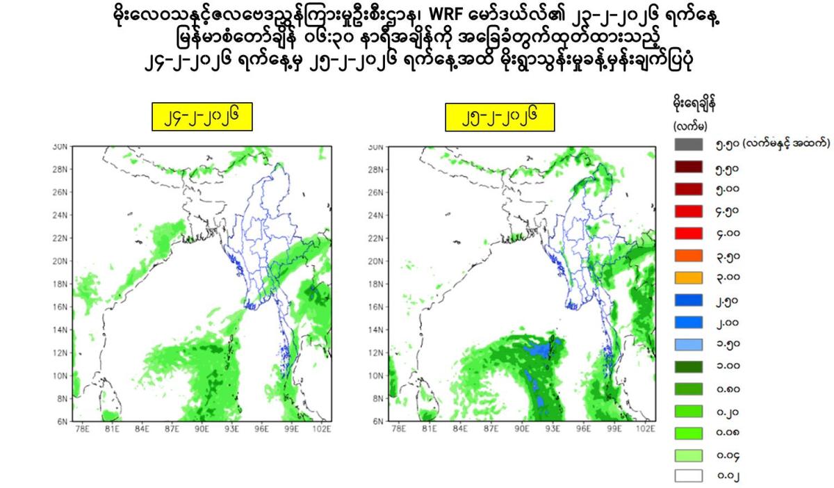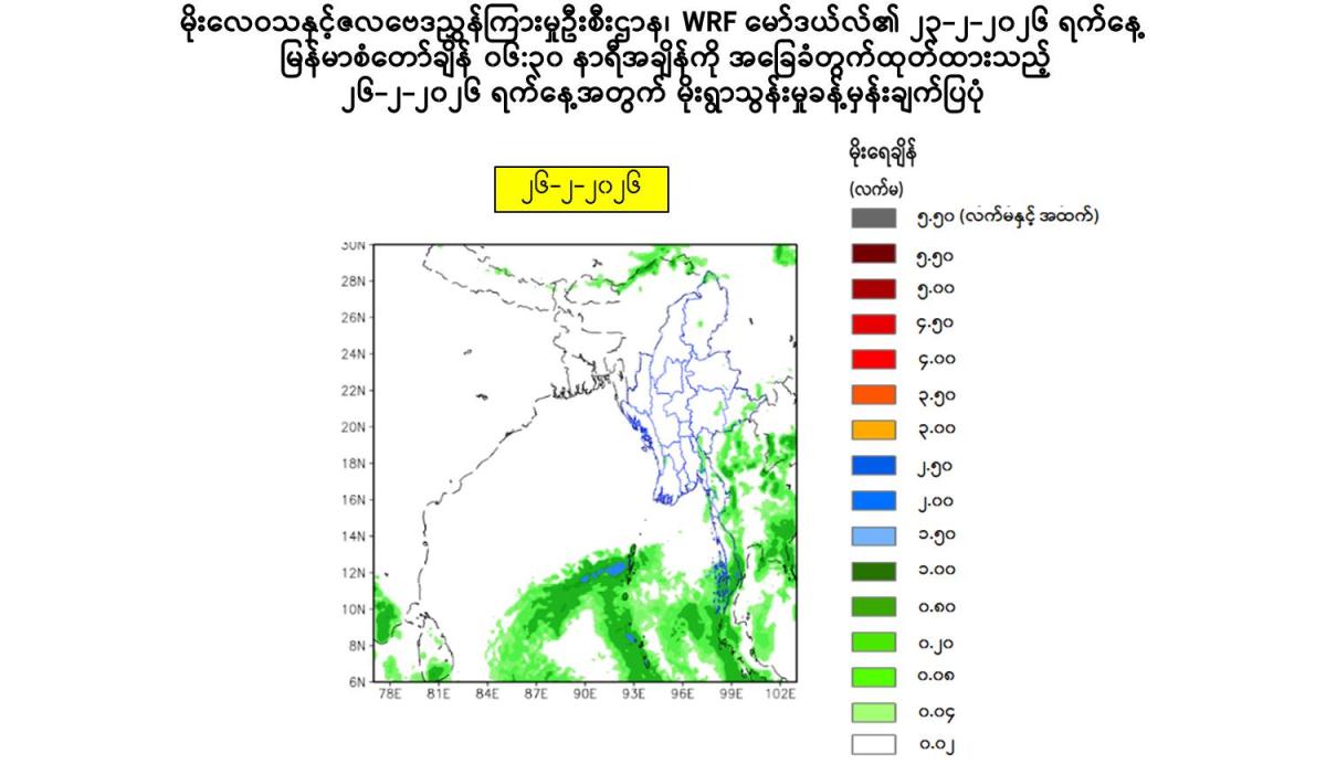 (ခ) အဆိုပါ လေဖိအားနည်းရပ်ဝန်း၏အရှိန်ကြောင့် ယနေ့နံနက်မှ ၂၆-၂-၂၀၂၆ ရက်နေ့ အတွင်း နေပြည်တော်၊ ရန်ကုန်တိုင်းဒေသကြီး၊ မန္တလေးတိုင်းဒေသကြီး၊ ပဲခူးတိုင်းဒေသကြီး၊ မကွေးတိုင်းဒေသကြီး၊ ဧရာဝတီတိုင်းဒေသကြီး၊ တနင်္သာရီတိုင်းဒေသကြီး၊ ကယားပြည်နယ်၊ ကရင်ပြည်နယ်၊ မွန်ပြည်နယ်၊ ရခိုင်ပြည်နယ်နှင့် ရှမ်းပြည်နယ် (တောင်ပိုင်းနှင့် အရှေ့ပိုင်း) တို့တွင် နေရာကွက်ကျားမှ နေရာကျဲကျဲ မိုးထစ်ချုန်း ရွာနိုင်ပါသည်။