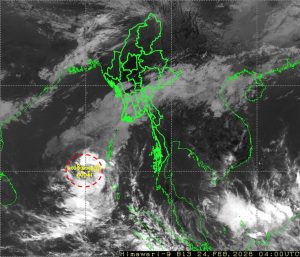 ၂၀၂၆ ခုနှစ်၊ ဖေဖော်ဝါရီလ ၂၄ ရက်နေ့ မြန်မာစံတော်ချိန် (၁၂:၀၀) နာရီအချိန်တွင် မိုးလေဝသနှင့် ဇလဗေဒညွှန်ကြားမှုဦးစီးဌာနမှ “လေဖိအားနည်းရပ်ဝန်းအခြေအနေ” ကို အောက်ပါအတိုင်း ထုတ်ပြန်ထားပါသည်-