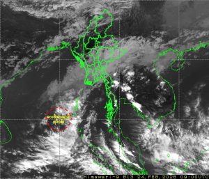 ၂၀၂၆ ခုနှစ်၊ ဖေဖော်ဝါရီလ ၂၄ ရက်နေ့ မြန်မာစံတော်ချိန် (၁၆:၀၀) နာရီအချိန်တွင် မိုးလေဝသနှင့် ဇလဗေဒညွှန်ကြားမှုဦးစီးဌာနမှ “လေဖိအားနည်းရပ်ဝန်းအခြေအနေ” ကို အောက်ပါအတိုင်း ထုတ်ပြန် ထားပါသည်-