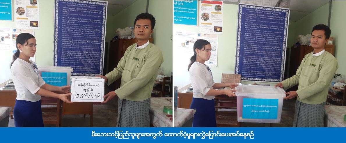 မကွေးတိုင်းဒေသကြီး၊ ချောက်မြို့နယ်၊ ပန်းဘဲ(မ)ကျေးရွာ၌ (၁၃-၁၂-၂၀၁၆) ရက်နေ့တွင် ဖြစ်ပွားခဲ့သော မီးဘေးသင့်အိမ်ခြေ (၁) အိမ်ထောင်စု (၁) စုမှ လူဦးရေ (၃) ဦးအတွက် အိမ်ဆောက်ပစ္စည်းဖိုး (၅၀၀၀၀)၊ ဆန်ရိက္ခာဖိုး (၂၇၀၀)၊ ထောက်ပံ့ငွေစုစုပေါင်း (၅၂၇၀၀) နှင့် ကဆရပစ္စည်း (၉) မျိုးနှင့် ပလပ်စတစ်ပုံး(၁)ပုံးတို့အား (၁၅-၁၂-၁၆) ရက်နေ့တွင် မကွေးတိုင်းဒေသကြီးဦးစီးမှူးရုံး (ကဆရ) မှ တာဝန်ရှိသူများသည် ချောက်မြို့နယ် အထွေထွေအုပ်ချုပ်ရေးဦးစီးဌာနမှ ဦးမျိုးမင်းဌေး (ဒုဦးစီးမှူး) ထံသို့ ထုတ်ပေးထောက်ပံ့ပြီးဖြစ်ပါကြောင်း သိရှိရပါသည်။