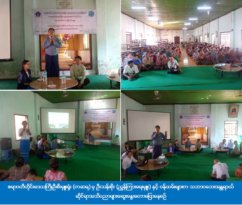 ဧရာ၀တီတိုင်းဒေသကြီး၊ ပုသိမ်မြို့နယ်၊ ရွှေမြင်တင်ကျေးရွာအုပ်စု၊ ဝါးယားချောင်းကျေးရွာရှိ ပြည်သူများ သဘာ၀ဘေး အန္တရာယ်ဆိုင်ရာအသိပညာဗဟုသုတများရရှိစေရန်အတွက် (၂၀-၁၂-၂၀၁၆) ရက်နေ့တွင် ကယ်ဆယ်ရေးနှင့် ပြန်လည်နေရာ ချထားရေးဦးစီးဌာန၊ ဧရာ၀တီတိုင်းဒေသကြီးဦးစီးမှူးရုံးမှ ဦးသန်းစိုး(ညွှန်ကြားရေးမှူး)နှင့် ဝန်ထမ်းများမှ သဘာ၀ဘေးအန္တရာယ် ဆိုင်ရာ အသိပညာများဆွေးနွေးဟောပြောပို့ချခဲ့ပါသည်။
