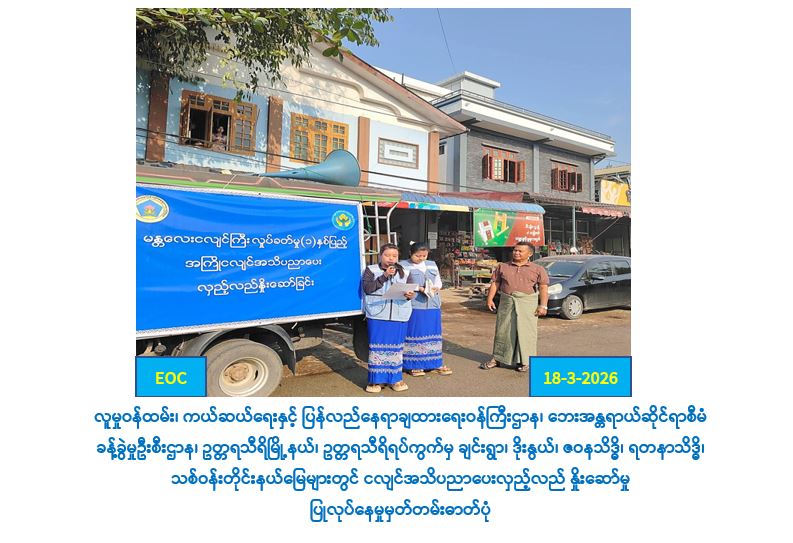 လူမှုဝန်ထမ်း၊ ကယ်ဆယ်ရေးနှင့်ပြန်လည်နေရာချထားရေးဝန်ကြီးဌာန၊ ဘေးအန္တရာယ်ဆိုင် ရာစီမံခန့်ခွဲမှုဦးစီးဌာန၊ ပြည်ထောင်စုနယ်မြေ၊ နေပြည်တော်၊ ဥတ္တရခရိုင်ဦးစီးမှူးရုံးမှ တာ၀န်ရှိ သူများသည် မန္တလေးငလျင်ကြီးလှုပ်ခတ်မှု (၁)နှစ်ပြည့်အကြိုအသိပညာပေးလှုပ်ရှားမှုအဖြစ် (၁၈.၃.၂၀၂၆) ရက်နေ့၌ ဥတ္တရသီရိမြို့နယ် ၊ဥတ္တရသီရိရပ်ကွက်မှ (ချင်းရွာ၊ဒိုးနွယ်၊ ဇဝနသိဒ္ဓိ၊ ရတနာသိဒ္ဓိ၊ သစ်ဝန်တိုင်း)နယ်မြေများတွင် ငလျင်အသိပညာပေးလှည့်လည်နှိုးဆော်ခြင်းများ ဆောင်ရွက်ခဲ့ပါကြောင်း သတင်းရရှိပါသည်။