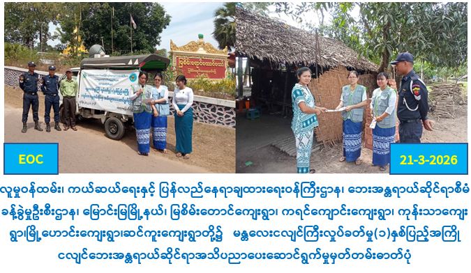 လူမှုဝန်ထမ်းကယ်ဆယ်ရေးနှင့်ပြန်လည်နေရာချထားရေးဝန်ကြီးဌာန၊ဘေးအန္တရာယ်ဆိုင်ရာစီမံခန့်ခွဲမှုဦးစီးဌာန၊ မြောင်းမြခရိုင်ဦးစီးမှူးရုံးမှ တာဝန်ရှိသူများဦးဆောင်၍ ခရိုင်/ မြို့နယ်စီမံခန့်ခွဲရေးနှင့်အုပ်ချုပ်ရေးကော်မတီအဖွဲ့ဝင်များ၊ ခရိုင်/ မြို့နယ်မီးသတ်ဦးစီးဌာန၊ ပြန်ကြားရေး နှင့်ပြည်သူ့ဆက်ဆံရေးဦးစီးဌာနတို့နှင့်ပူးပေါင်း၍ (၂၁-၃-၂၀၂၆)ရက်နေ့တွင် မြောင်းမြမြို့နယ်၊ မြစိမ်းတောင်ကျေးရွာ၊ ကရင်ကျောင်းကျေး ရွာ၊ ကုန်းသာကျေးရွာ၊ မြို့ဟောင်းကျေးရွာ၊ ဆင်ကူးကျေးရွာတို့၌ မန္တလေးငလျင်ကြီး လှုပ်ခတ်မှု(၁)နှစ်ပြည့် အကြိုငလျင်ဘေးအန္တရာယ်ဆိုင်ရာ အသိပညာပေး ဆောင်ရန်/ရှောင်ရန်အချက်များအား ရပ်ကွက်၊ ကျေးရွာနေပြည်သူ များ သိရှိစေရန်အတွက် လိုက်လံနှိုးဆော်အသိပညာပေးခြင်းနှင့် လက်ကမ်းစာစောင်များ ဖြန့်ဝေပေးခြင်းများအား ဆောင်ရွက်ခဲ့ပါကြောင်းသတင်းရရှိပါသည်။