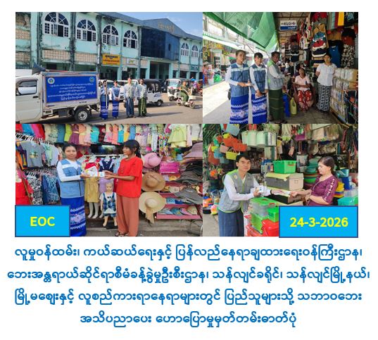 လူမှုဝန်ထမ်း၊ကယ်ဆယ်ရေးနှင့်ပြန်လည်နေရာချထားရေးဝန်ကြီးဌာန၊ ဘေးအန္တရာယ်ဆိုင်ရာစီမံခန့်ခွဲမှုဦးစီးဌာန၊ ရန်ကုန်တောင်ပိုင်းခရိုင်ဦးစီးမှူးရုံး(သန်လျင်)မှ တာဝန်ရှိသူများသည် (၂၄ – ၃ -၂၀၂၆) ရက်နေ့၊ ညနေ (၁၆း၀၀)နာရီအချိန်တွင် သန်လျင်ခရိုင်၊ သန်လျင်မြို့နယ် ၊ မြို့မဈေးနှင့်လူစည်ကားရာနေရာများတွင် ပြည်သူများသို့ သဘာ၀ဘေးအသိပညာပေး ဆောင်ရန်/ရှောင်ရန်အချက်များအား လှည့်လည်နှိုး ဆော်ခြင်း၊ လက်ကမ်းစာစောင်များ လိုက်လံဝေငှခြင်းများ ဆောင်ရွက်ခဲ့ကြောင်း သတင်းရရှိပါသည်။