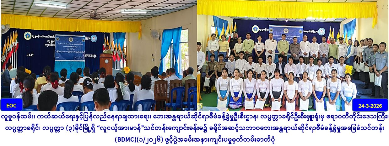 လူမှုဝန်ထမ်း၊ ကယ်ဆယ်ရေးနှင့်ပြန်လည်နေရာချထားရေး၊ ဘေးအန္တရာယ်ဆိုင်ရာစီမံခန့်ခွဲမှုဦးစီးဌာန၊လပွတ္တာခရိုင်ဦးစီးမှူးရုံးမှတာဝန်ရှိသူများသည်ဧရာဝတီတိုင်းဒေသကြီး၊ လပွတ္တာခရိုင်၊ လပွတ္တာ (၃)မိုင်မြို့ရှိ “လူငယ့်အားမာန်”သင်တန်းကျောင်းခန်းမ၌ ခရိုင်အဆင့်သဘာဝဘေး အန္တရာယ်ဆိုင်ရာစီမံခန့်ခွဲမှုအခြေခံသင်တန်း (BDMC)(၁/၂၀၂၆)ဖွင့်ပွဲအခမ်းအနားကို (၂၄-၃-၂၀၂၆) ရက်နေ့ (၀၉:၀၀) နာရီအချိန်တွင် ကျင်းပ ပြုလုပ်ခဲ့ပါသည်။ အဆိုပါသင်တန်းကို ဒေသတွင်း သဘာဝဘေးအန္တရာယ်များကျရောက်လာပါက အချိန်နှင့်တစ်ပြေးညီ တုံ့ပြန်ဆောင်ရွက်နိုင်ရန်နှင့် စီမံခန့်ခွဲမှုစွမ်းရည်များ မြှင့်တင်နိုင်ရန်ရည်ရွယ်၍ ဖွင့်လှစ်ခြင်းဖြစ်ပြီး သင်တန်းသို့ ခရိုင်နှင့်မြို့နယ်အဆင့်တို့၌ ဖွဲ့စည်းထားသည့် သဘာဝဘေးအန္တရာယ်ဆိုင်ရာစီမံခန့်ခွဲမှုအဖွဲ့အသီးသီးတွင်ပါဝင်တာဝန်ယူဆောင်ရွက်နေသောဌာနဆိုင်ရာများမှ သင်တန်း သား/သူ စုစုပေါင်း (၃၀) ဦး တက်ရောက်ခဲ့ကြပါသည်။ သင်တန်းကာလမှာ (၂၄-၃-၂၀၂၆) ရက်နေ့မှ (၂၆-၃-၂၀၂၆) ရက်နေ့အထိ (၃) ရက်တာ ကြာမြင့်မည်ဖြစ်ပါကြောင်း သတင်းရရှိပါသည်။