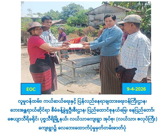 လူမှုဝန်ထမ်း၊ ကယ်ဆယ်ရေးနှင့် ပြန်လည်နေရာချထားရေးဝန်ကြီးဌာန၊ ဘေးအန္တရာယ်ဆိုင်ရာစီမံခန့်ခွဲမှုဦးစီးဌာန၊ ပြည်ထောင်စုနယ်မြေ၊ နေပြည်တော်၊ ဇေယျာသီရိခရိုင်၊ ပုဗ္ဗသီရိမြို့နယ်၊ လယ်သာကျေးရွာ အုပ်စု၊ (လယ်သာ၊ ဇလုပ်ကြီး)ကျေးရွာ၌ (၈.၄.၂၀၂၆)ရက်နေ့(၁၈:၀၀) အချိန်ခန့်တွင်ဖြစ်ပွားခဲ့သောလေဘေးကြောင့်ပျက်စီးခဲ့သည့် တစ်စိတ်တစ်ပိုင်းနေအိမ် (၁) လုံးနှင့် လုံးဝပျက်စီးနေအိမ်(၂)လုံးအတွက် အိမ်ဆောက်ပစ္စည်းဖိုးထောက်ပံ့ငွေ (၂၅၀,၀၀၀ိ/-) အား (၉.၄.၂၀၂၆)ရက်နေ့၊ (၁၁:၀၀)အချိန်တွင် ဥတ္တရခရိုင်ဦးစီးမှူးရုံးမှတာဝန်ရှိသူများသည် ကျေးရွာအုပ်ချုပ်ရေးမှူးများနှင့်အတူဘေးသင့်ပြည်သူများလက်ဝယ်သို့သွားရောက်ထောက်ပံ့ခဲ့ကြောင်းသတင်းရရှိပါသည်။