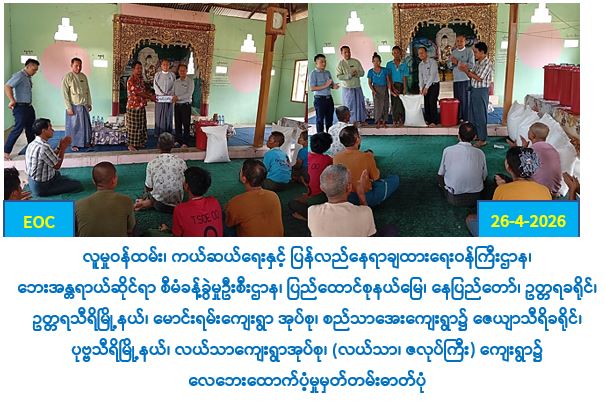 လူမှုဝန်ထမ်း၊ ကယ်ဆယ်ရေးနှင့် ပြန်လည်နေရာချထားရေးဝန်ကြီးဌာန၊ ဘေးအန္တရာယ်ဆိုင် ရာစီမံခန့်ခွဲမှုဦးစီးဌာန၊ ပြည်ထောင်စုနယ်မြေ၊ နေပြည်တော်၊ ဥတ္တရခရိုင်၊ ဥတ္တရသီရိမြို့နယ်၊ မောင်းရမ်းကျေးရွာအုပ်စု၊ စည်သာအေးကျေးရွာ၌ (၂၅.၄.၂၀၂၆)ရက်နေ့ (၁၇း၃၀)အချိန်ခန့် တွင်ဖြစ်ပွားခဲ့သော လေဘေးကြောင့် လုံးဝပျက်စီးနေအိမ် (၁)လုံးနှင့် တစ်စိတ်တစ်ပိုင်း ပျက်စီး နေအိမ်(၄)လုံးတို့အတွက် အိမ်ဆောက်ပစ္စည်းဖိုးထောက်ပံ့ငွေ (၃၀၀,၀၀၀ိ/-)၊ စုစုပေါင်းထောက်ပံ့ငွေ (၃၀၀,၀၀ဝိ/-)တို့အား (၂၆.၄.၂၀၂၆)ရက်နေ့၊ (၁၃း၀၀)အချိန်တွင်၊ မောင်းရမ်းကျေးရွာအုပ်စု၊ စည်သာအေးကျေးရွာဓမ္မာရုံ၌ နေပြည်တော်ကောင်စီဝင် ဦးထွန်းထွန်း၊ ဘေး/စီမံ နေပြည်တော်တိုင်းဦးစီးမှူး ဦးစဝီလီဖရန့်၊ ဥတ္တရသီရိမြို့နယ် အထွထွေအုပ်ချုပ်ရေးဦးစီးဌာနမှ မြို့နယ်အုပ်ချုပ်ရေးမှူး ဦးရဲမြတ်သိန်း၊ ကျေးရွာအုပ်ချုပ်ရေးမှူးများနှင့်အတူ ဥတ္တရခရိုင်ဦးစီးမှူးရုံးမှတာဝန်ရှိသူများသည် ဘေးသင့်ပြည်သူများ လက်ဝယ်သို့ သွားရောက်ထောက်ပံ့ခဲ့ပါကြောင်း သတင်းရရှိပါသည်။