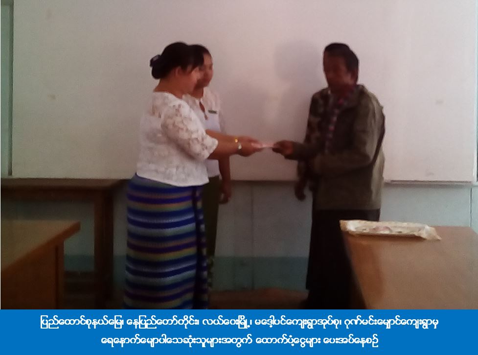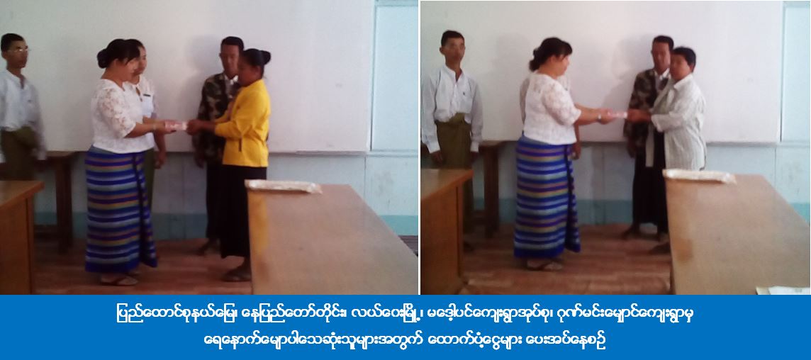 ပြည်ထောင်စုနယ်မြေ၊ နေပြည်တော်တိုင်း၊ လယ်ဝေးမြို့၊ မဒေါ့ပင်ကျေးရွာအုပ်စု၊ ဂုဏ်မင်းမျှောင်ကျေးရွာတွင် ချောင်းရေကြီးမှုကြောင့် ရေနောက်မျောပါသေဆုံးခဲ့သူ (၃) ဦး၏ မိသားစုများတစ်စုစီထံသို့ သေဆုံးသူတစ်ဦးလျှင်ထောက်ပံ့ငွေ (၁) သိန်းကျပ်စီဖြင့် ထောက်ပံ့ငွေစုစုပေါင်း (၃) သိန်းကျပ်တိတိအား ပြည်ထောင်စုနယ်မြေ၊ နေပြည်တော်တိုင်းဦးစီးမှူးရုံး (ကဆရ) မှ တာဝန်ရှိသူများက (၂၀-၁၂-၂၀၁၆) ရက်နေ့တွင် သွားရောက်ထောက်ပံ့ပေးခဲ့ကြောင်း သိရှိရပါသည်။