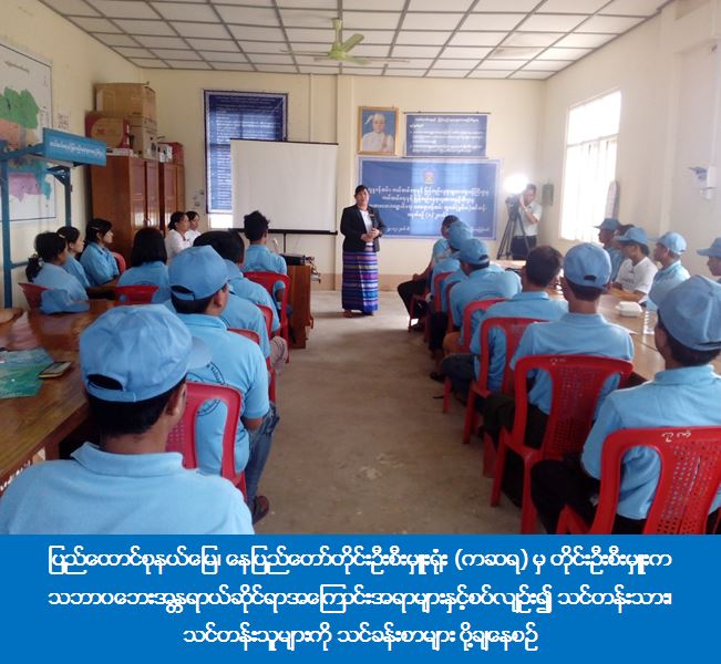 ပြည်ထောင်စုနယ်မြေ၊ နေပြည်တော်တိုင်းဦးစီးမှူးရုံး (ကဆရ) ၌ သဘာဝဘေးလျော့ပါးရေးစေတနာ့ဝန်ထမ်းလူငယ်မွမ်းမံသင်တန်း ၁/၂၀၁၆ ကို (၂၁-၁၂-၂၀၁၆) မှ (၂၃-၁၂-၂၀၁၆) နေ့အထိ ဖွင့်လှစ်ခဲ့ရာ သင်တန်းသား၊ သင်တန်းသူဦးရေစုစုပေါင်း (၃၀) ဦး တက်ရောက်ခဲ့ကြောင်း သိရှိရပါသည်။