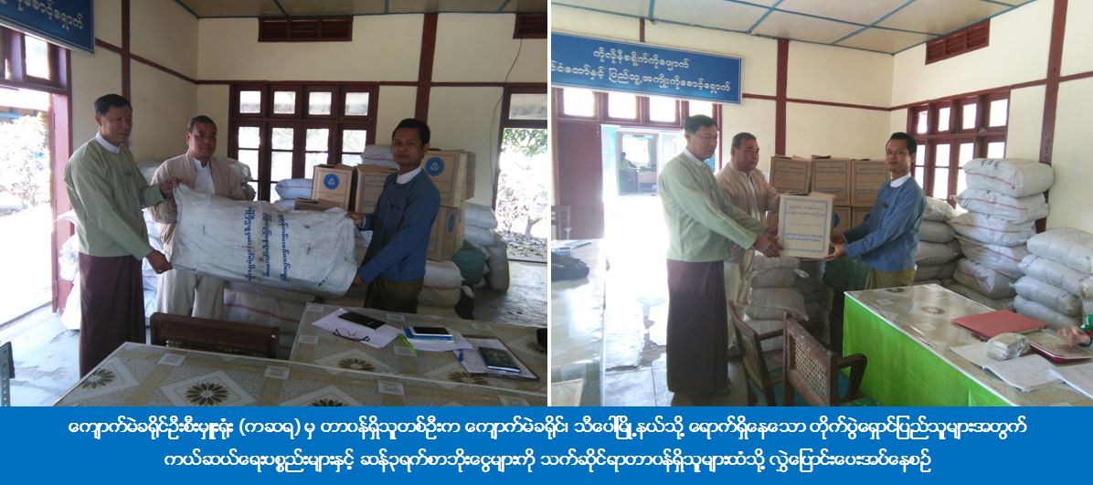 (၂၂-၁၂-၂၀၁၆) ရက်နေ့တွင် ကျောက်မဲခရိုင်ဦးစီးမှူးရုံး (ကဆရ) မှ တာဝန်ရှိသူများသည် ကျောက်မဲခရိုင်၊ သီပေါမြို့နယ်သို့ ရောက်ရှိနေသော တိုက်ပွဲရှောင်ပြည်သူ အိမ်ထောင်စု (၃၀၈) စုမှ လူဦးရေ (၄၉၁) ဦးအတွက် ကယ်ဆယ်ရေးပစ္စည်း (၉) မျိုး အိမ်ထောင်စု (၃၀၈) စုစာနှင့် ဆန်၃ရက်စာဘိုးငွေ (၄၄၁၉၀၀) ကျပ်တိတိအား သက်ဆိုင်ရာတာဝန်ရှိသူများထံသို့ လွှဲပြောင်းထောက်ပံ့ခဲ့ကြောင်း သိရှိရပါသည်။