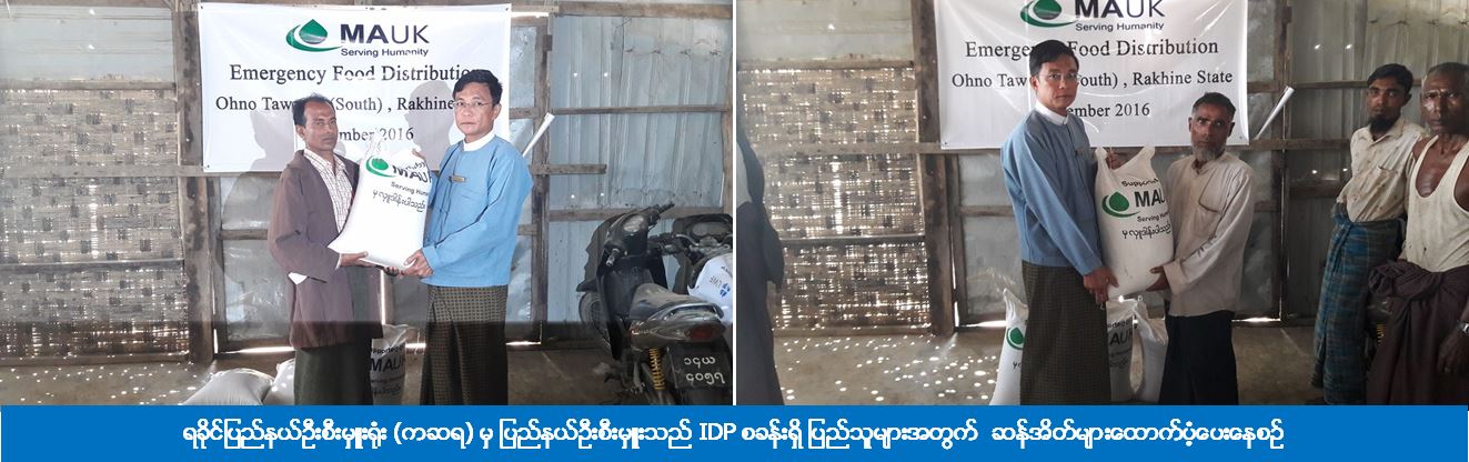 (၂၇-၁၂-၂၀၁၆) ရက်နေ့တွင် ရခိုင်ပြည်နယ်ဦးစီးမှူးရုံး (ကဆရ) မှ ပြည်နယ်ဦးစီးမှူးနှင့်တာဝန်ရှိသူများသည် စစ်တွေမြို့နယ်ရှိ IDP စခန်းများဖြစ်သည့် အုန်းတောကြီးတောင်နှင့် ဆေးသမားကြီးစခန်းများသို့ သွားရောက်ကာ အဆိုပါစခန်းရှိ ပြည်သူများအတွက် လူမူဝန်ထမ်း၊ ကယ်ဆယ်ရေးနှင့် ပြန်လည်နေရာချထားရေးဝန်ကြီးဌာနနှင့် MAUK အဖွဲ့တို့ပူးပေါင်း၍ အိမ်ထောင်စုပေါင်း (၂၅၀) စုအတွက် ဆန် (၂၅၀) အိတ် ထောက်ပံ့ပေးခဲ့ကြောင်း သိရှိရပါသည်။