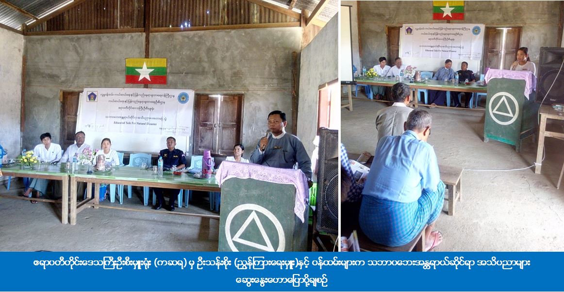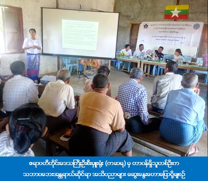 ဧရာဝတီတိုင်းဒေသကြီး၊ ငပုတောမြို့နယ်၊ သက္ကယ်ချောင်းကျေးရွာအုပ်စု၊ သက္ကယ်ချောင်းကျေးရွာရှိ ပြည်သူများ သဘာဝဘေးအန္တရာယ်ဆိုင်ရာ အသိပညာဗဟုသုတများရရှိစေရန်အတွက် (၂၇-၁၂-၂၀၁၆) ရက်နေ့တွင် ကယ်ဆယ်ရေးနှင့် ပြန်လည်နေရာချထားရေးဦးစီးဌာန၊ ဧရာဝတီတိုင်းဒေသကြီးဦးစီးမှူးရုံးမှ ဦးသန်းစိုး (ညွှန်ကြားရေးမှူး)နှင့် ဝန်ထမ်းများက သဘာဝဘေးအန္တရာယ်ဆိုင်ရာ အသိပညာများ ဆွေးနွေးဟောပြောပို့ချခဲ့ပါသည်။ အသိပညာပေးဆွေးနွေးပွဲသို့ ငပုတောမြို့နယ်၊ မီးသတ်ဦးစီးဌာန၊ မွေးမြူရေးနှင့် ကုသရေးဦးစီးဌာနတို့မှ တာဝန်ရှိသူများ၊ ကျေးရွာအုပ်ချုပ်ရေးမှူး၊ ရပ်မိရပ်ဖများနှင့် ရပ်ရွာပြည်သူလူထု စုစုပေါင်း (၁၀၅) ဦးခန့် တက်ရောက်ခဲ့ကြောင်းနှင့် ဘေး (၈) မျိုး လက်ကမ်းစာစောင်များ၊ နံရံကပ်ပိုစတာများအား ဖြန့်ဝေပေးအပ်ခဲ့ကြောင်း သိရှိရပါသည်။