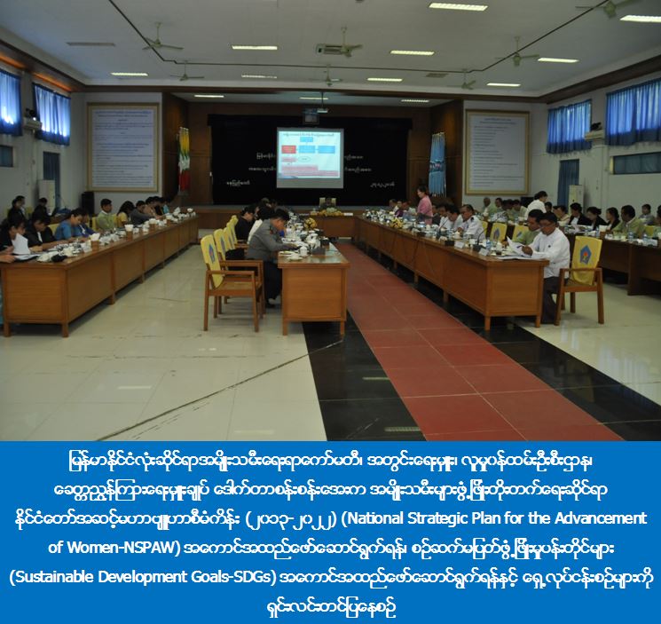 ဆက်လက်၍ အမျိုးသမီးများဖွံ့ဖြိုးတိုးတက်ရေးဆိုင်ရာ နိုင်ငံတော်အဆင့်မဟာ ဗျူဟာစီမံကိန်း (၂၀၁၃-၂၀၂၂) (National Strategic Plan for the Advancement of Women-NSPAW) အကောင်အထည်ဖော်ဆောင်ရွက်ရန်၊ စဉ်ဆက်မပြတ် ဖွံ့ဖြိုးမှု ပန်းတိုင်များ (Sustainable Development Goals-SDGs) အကောင်အထည်ဖော် ဆောင်ရွက်ရန်နှင့် ရှေ့လုပ်ငန်းစဉ်များကို မြန်မာနိုင်ငံလုံးဆိုင်ရာအမျိုးသမီးရေးရာ ကော်မတီ၊ အတွင်းရေးမှူး၊ လူမှုဝန်ထမ်းဦးစီးဌာန၊ ခေတ္တညွှန်ကြားရေးမှူးချုပ် ဒေါက်တာစန်းစန်းအေးက ရှင်းလင်းတင်ပြသည်။